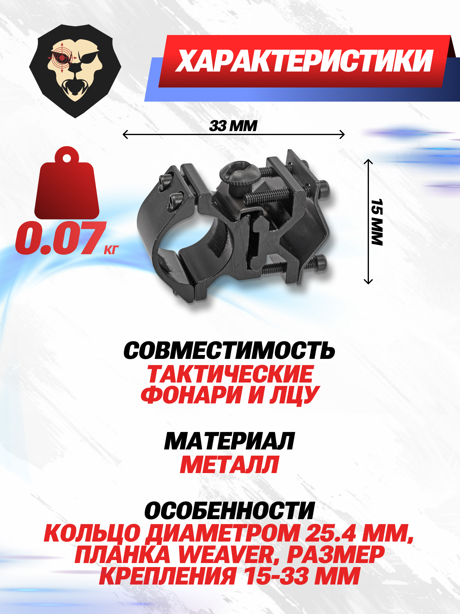 | Особенности | Кольцо диаметром 25.4 мм, планка Weaver, размер крепления 15-33 мм |