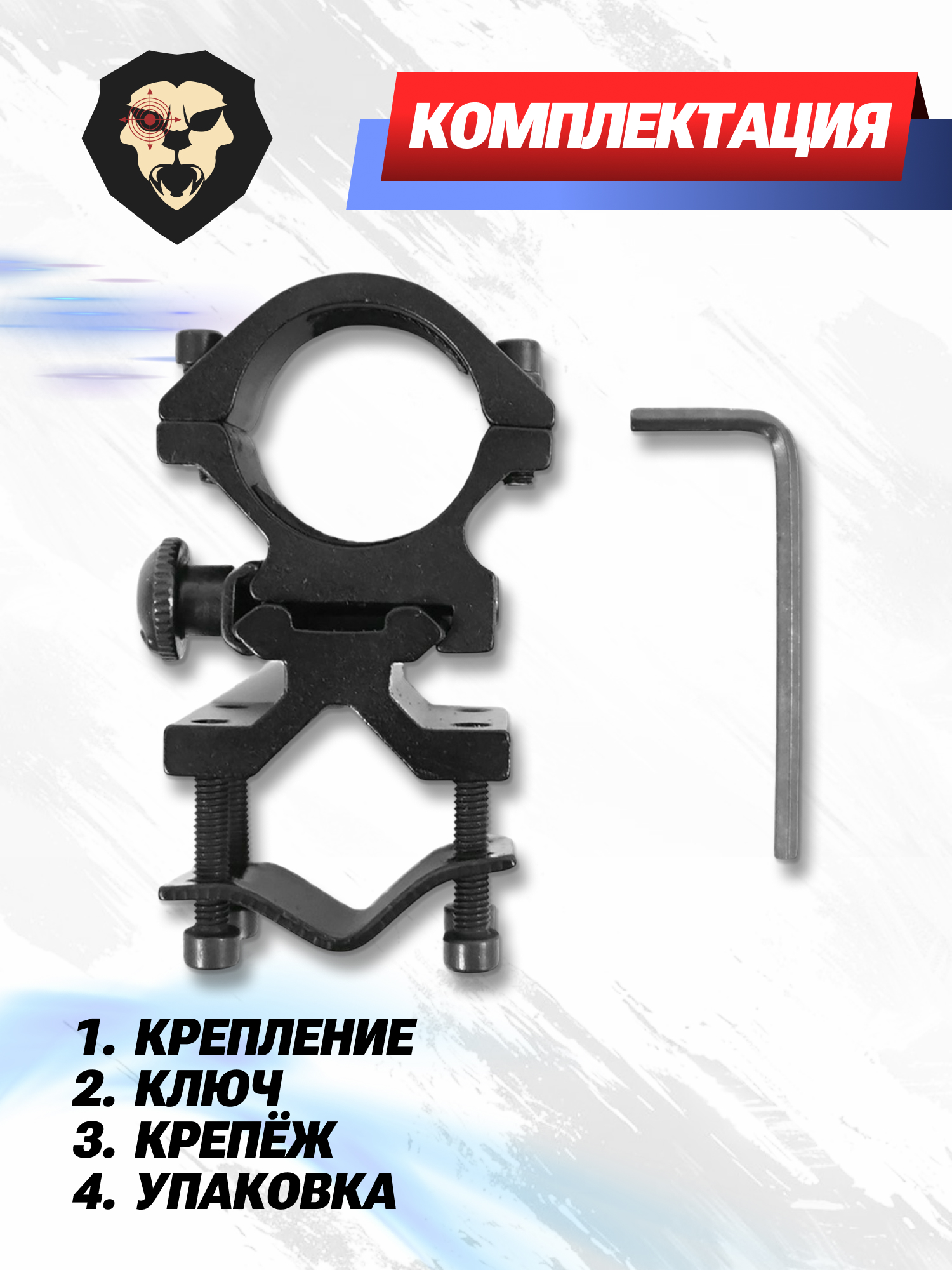 В комплект входит монтажное кольцо с посадочным диаметром 25.4 миллиметров, подходящее для различных фонарей в форм-факторе цилиндрической трубки соответствующего размера. На внутренней поверхности крепежного элемента наклеена прорезиненная пластинка, повышающая плотность прилегания приборов.