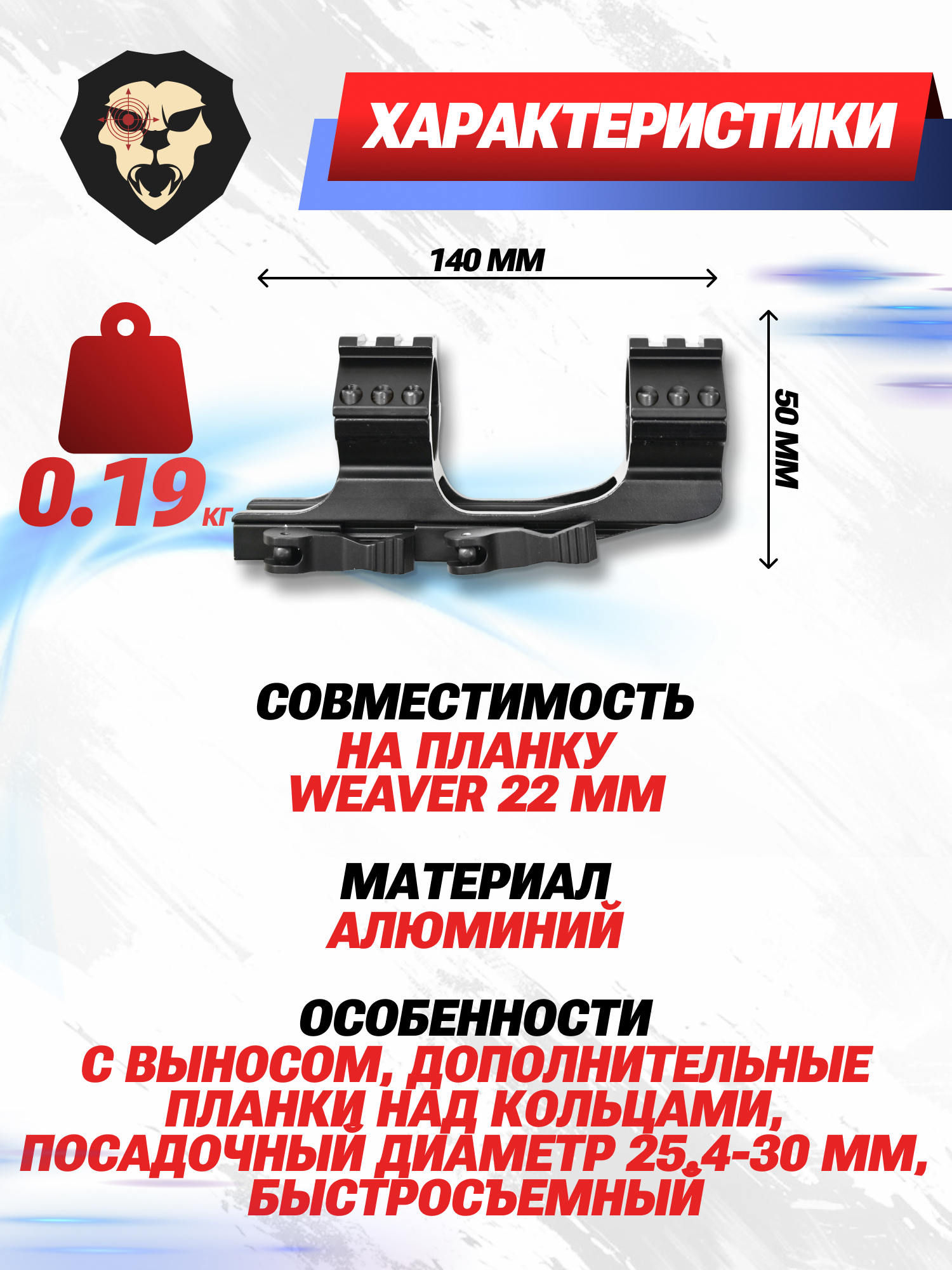 | Особенности | С выносом, дополнительные планки над кольцами, посадочный диаметр 25.4-30 мм, быстросъемный |