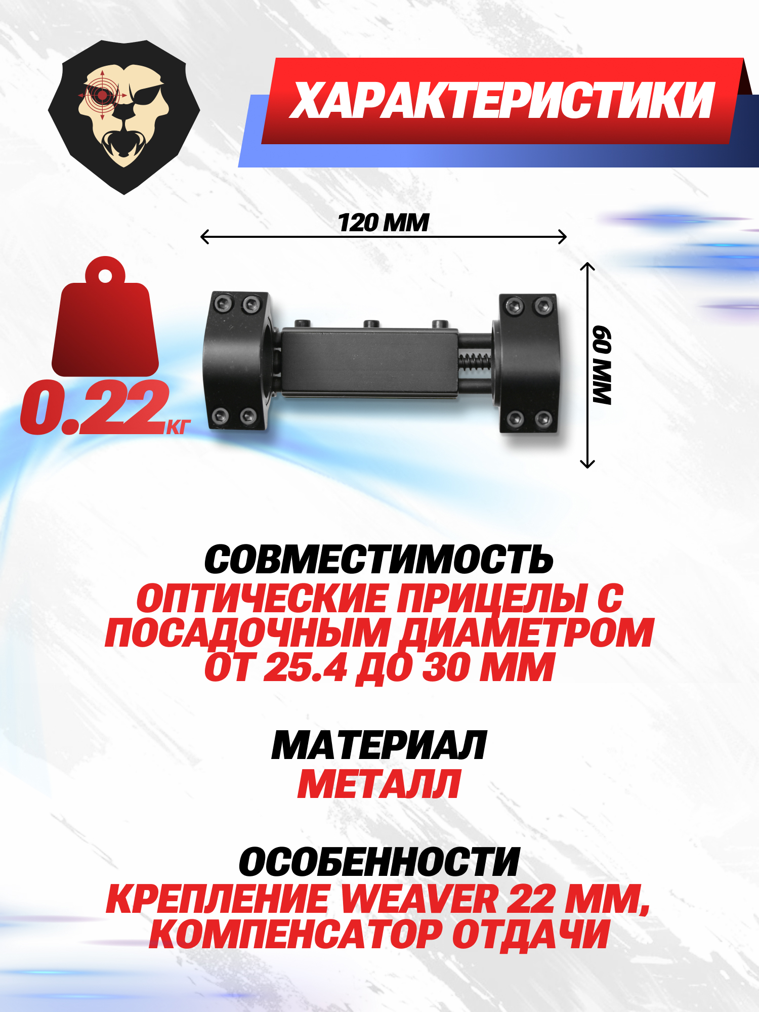 Кронштейн крепления оптики предназначен для установки прицелов с установочным диаметром от 25.4 до 30 миллиметров. Главная особенность кронштейна заключается в том, что он оснащается функцией компенсатора отдачи.