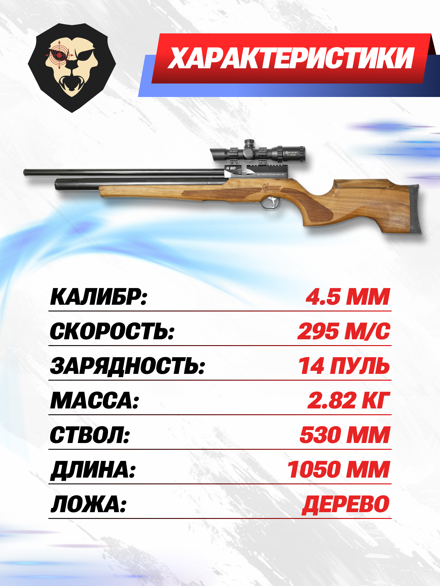 Информация о товаре "Пневматическая винтовка Kuzey K60 4.5 мм (Орех, PCP)" носит ознакомительный характер, и не является публичной офертой, определяемой положениями Статьи 437 Гражданского кодекса Российской Федерации, характеристики, внешний вид, цвет и комплектация могут быть изменены производителем без уведомления.