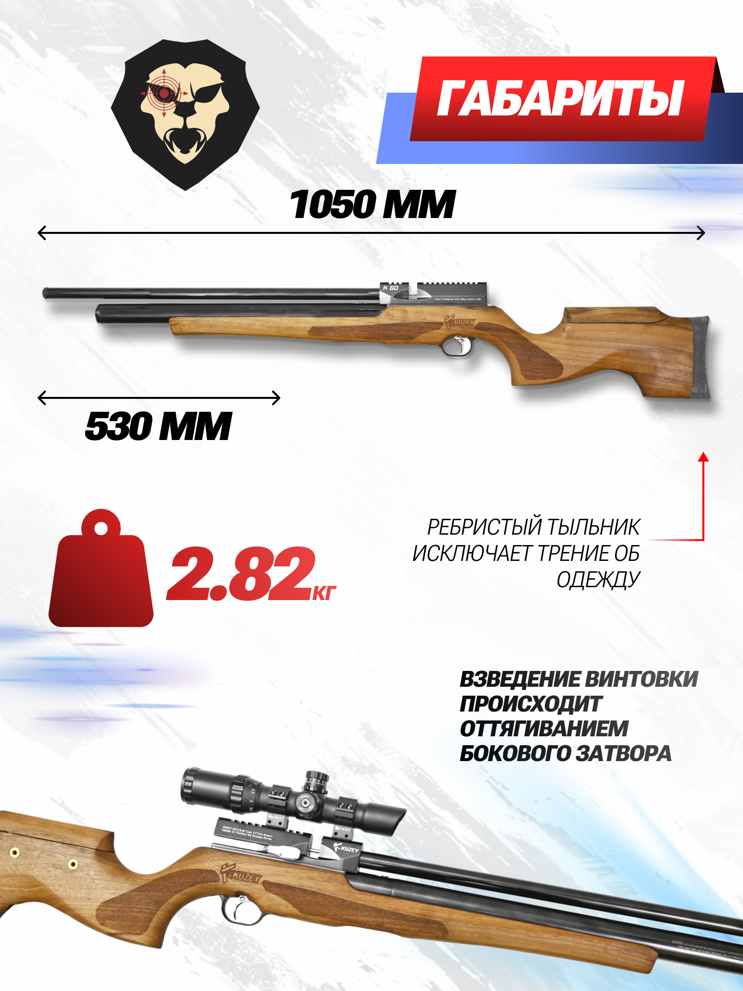 Общая длинна пневматической ПСП винтовки Kuzey K60 составляет 1050 миллиметров, а вес 2.82 килограмм. Все металлический элементы пневматики Кузей покрыты защитным воронением, которое предотвращает процессы коррозии