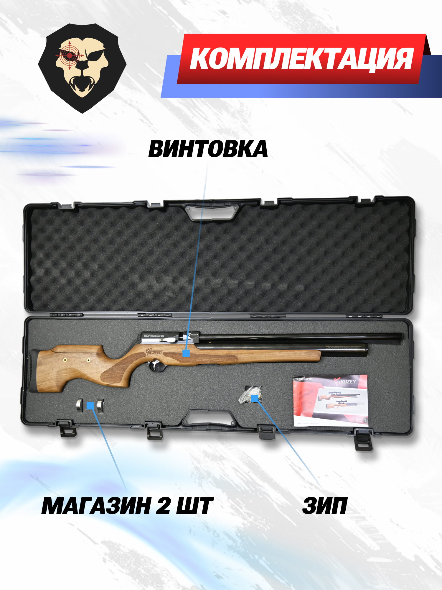 | Комплектация | Винтовка, упаковка, заправочный штуцер, краткая документация, копия сертификата (по запросу покупателя), 2 магазина |