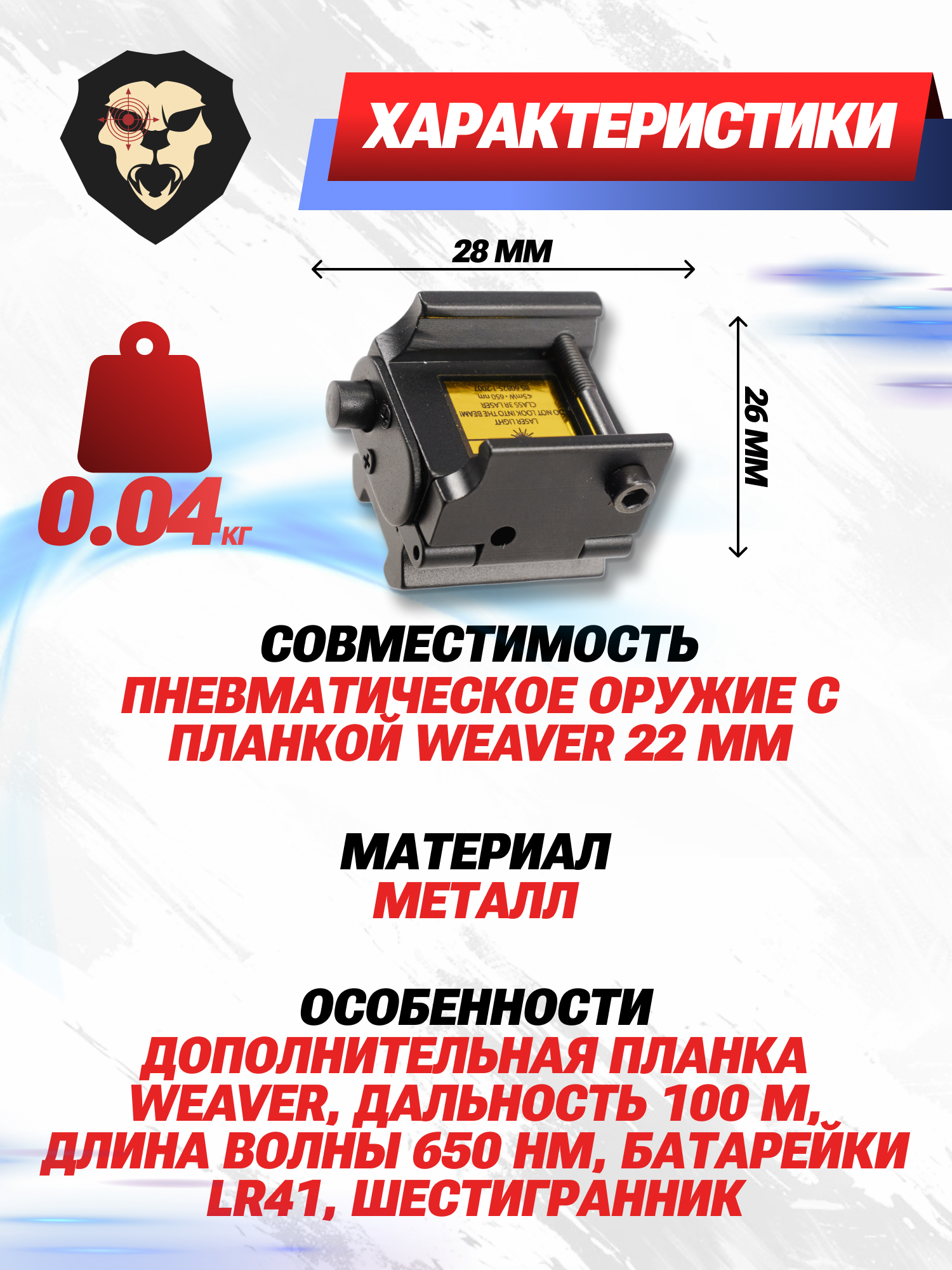 | Особенности | Дополнительная планка Weaver, дальность 100 м, длина волны 650 нм, 28x26 мм, батарейки LR41, шестигранник |