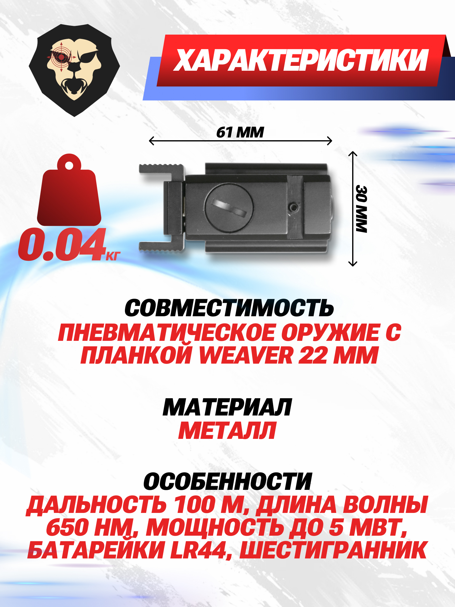 | Особенности | Размер 61x30х21 мм, дальность 100 м, длина волны 650 нм, мощность до 5 мВт, батарейки LR44, шестигранник |