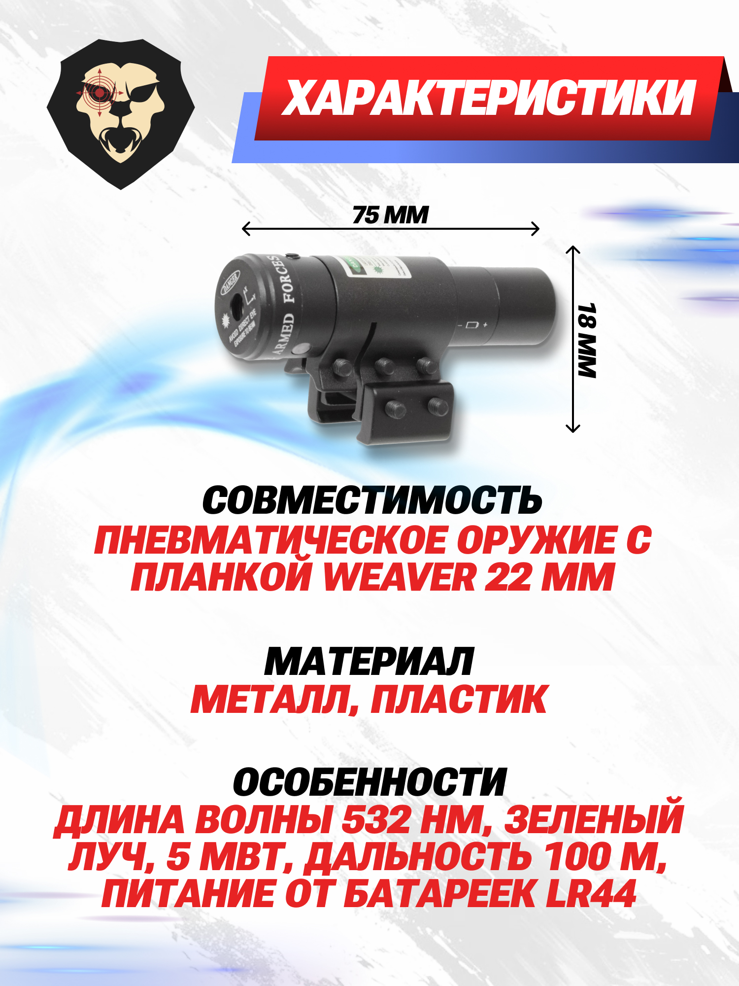 | Особенности | Длина волны 532 нм, зеленый луч, 5 мВт, дальность 100 м, питание от батареек LR44, размер 75x18 мм |