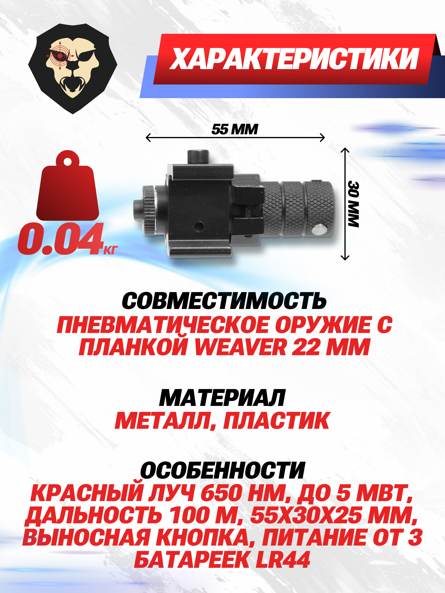 | Особенности | Красный луч 650 нм, до 5 мВт, дальность 100 м, 55x30x25 мм, выносная кнопка, питание от 3 батареек LR44 |