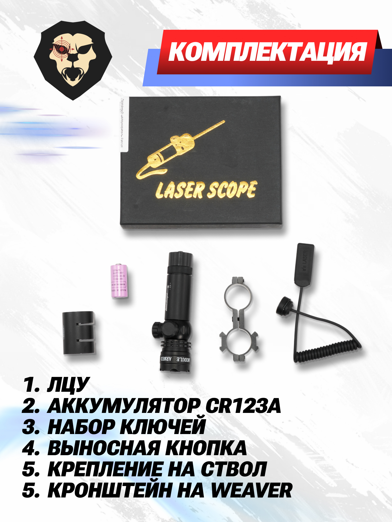 | Комплектация | Лазерный целеуказатель, аккумулятор CR123A, шестигранный ключ, выносная кнопка, крепление на ствол, кронштейн на Weaver, краткая документация, упаковка |