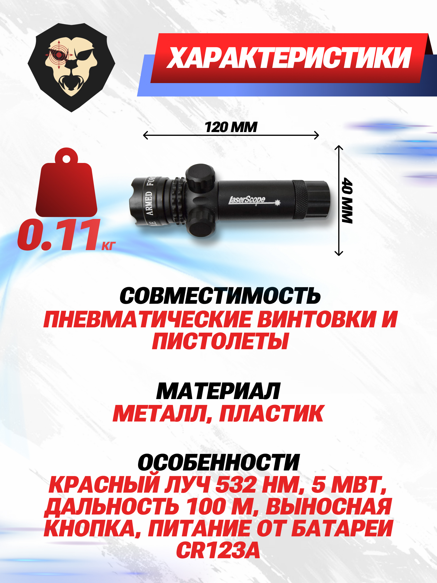 | Особенности | Красный луч 532 нм, 5 мВт, дальность 100 м, выносная кнопка, питание от батареи CR123A |