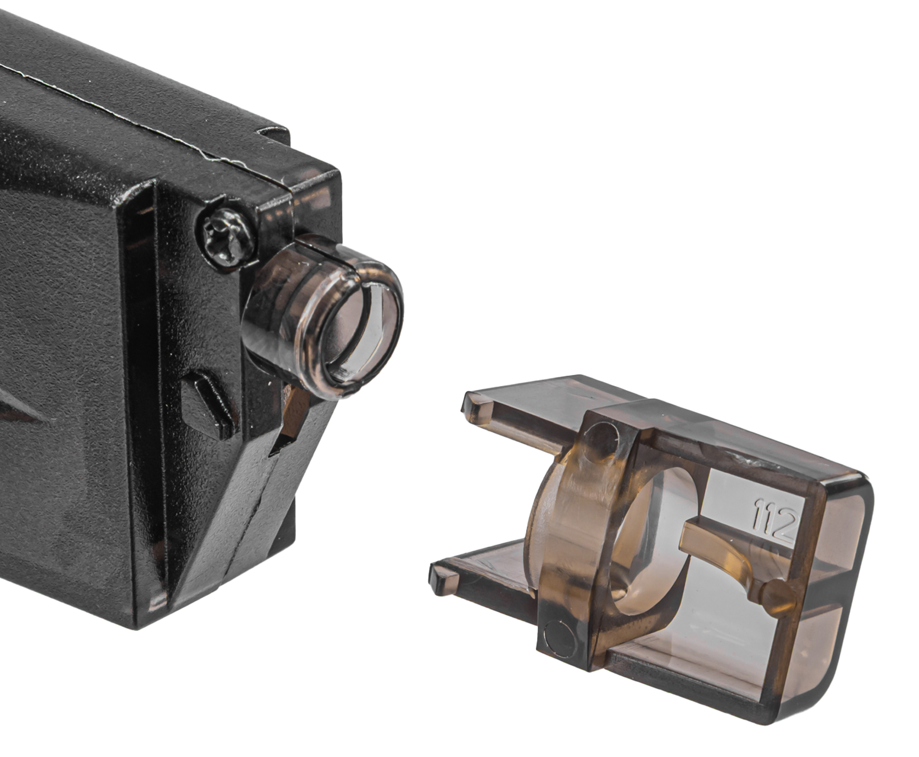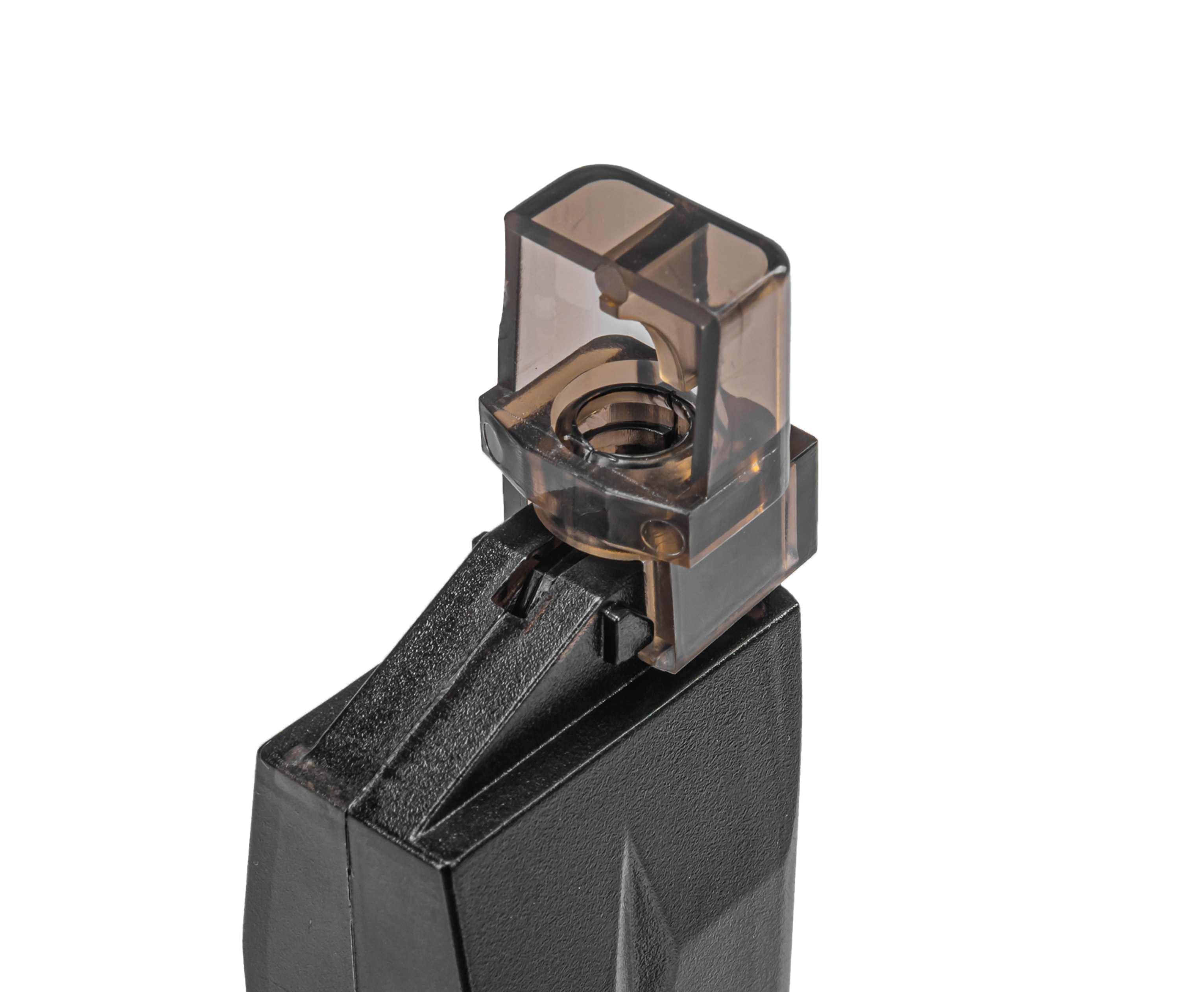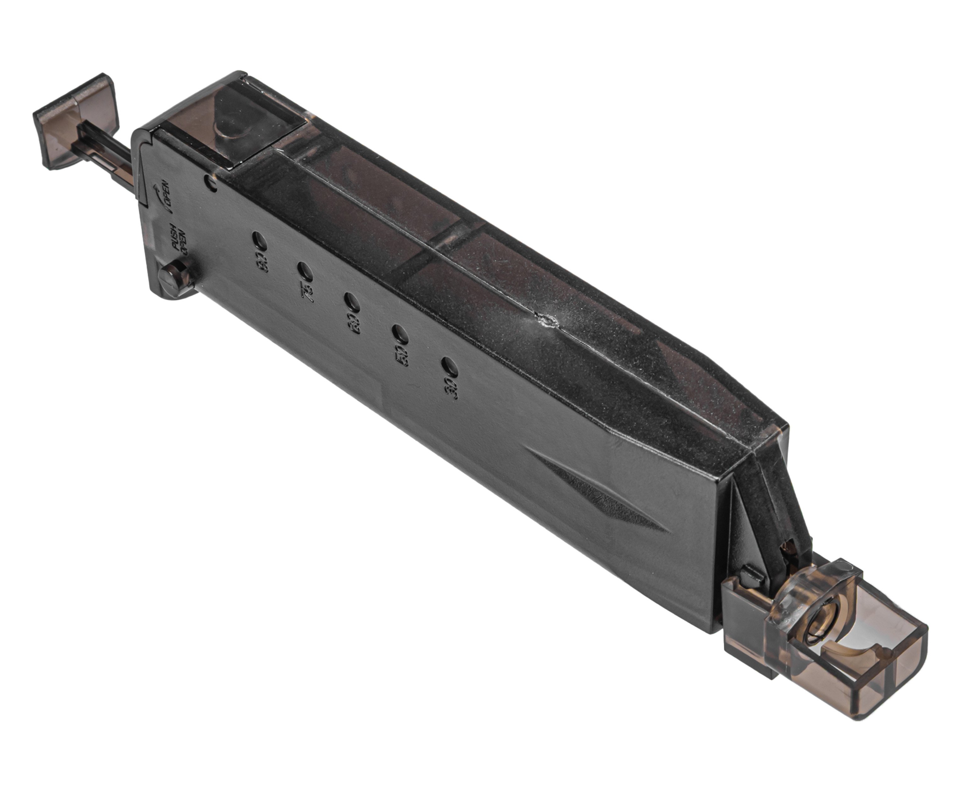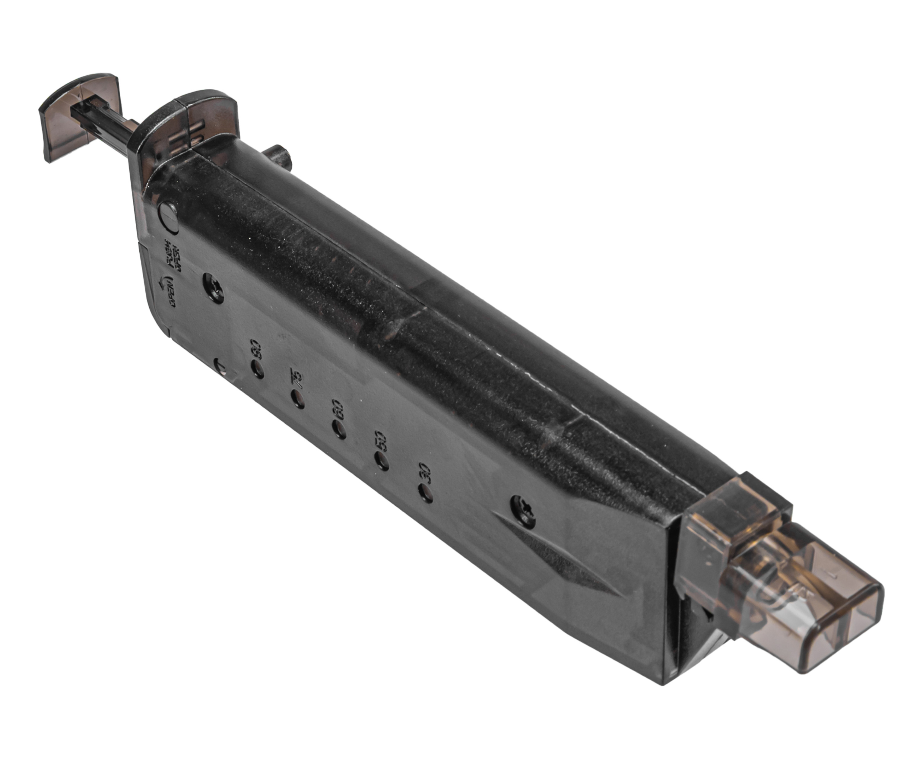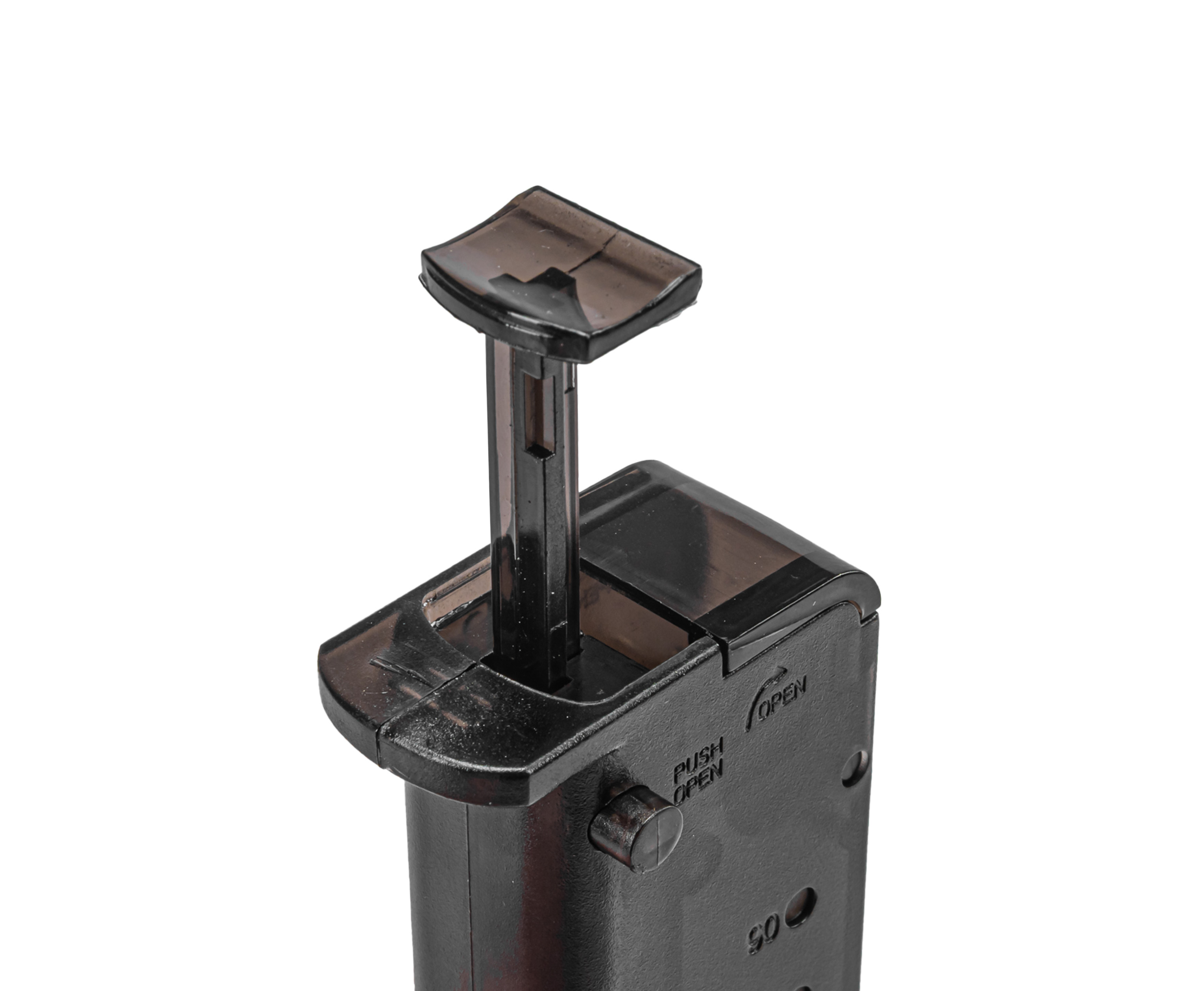 При движении внутреннего штока шарики попадают в направляющий канал и через носик по несколько штук за раз загружаются внутрь элемента боепитания. В комплекте с моделью C19A идет съемный адаптер под губки пистолетных магазинов, что расширяет спектр применения лоадера.