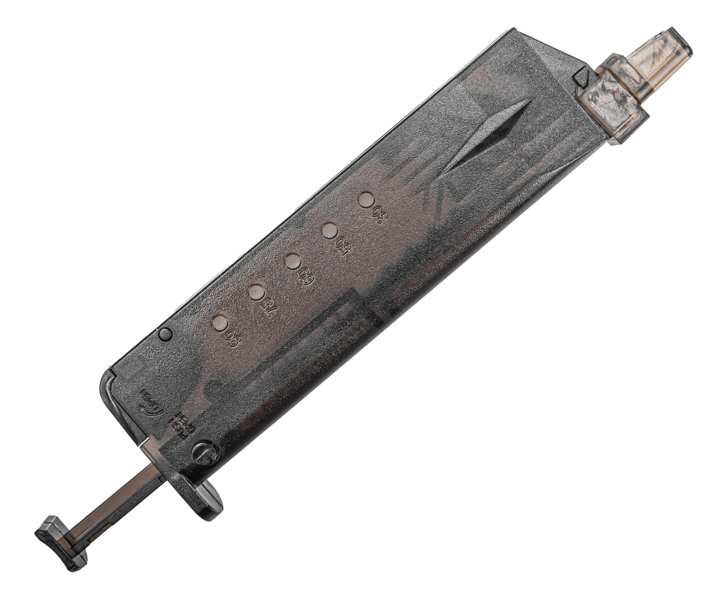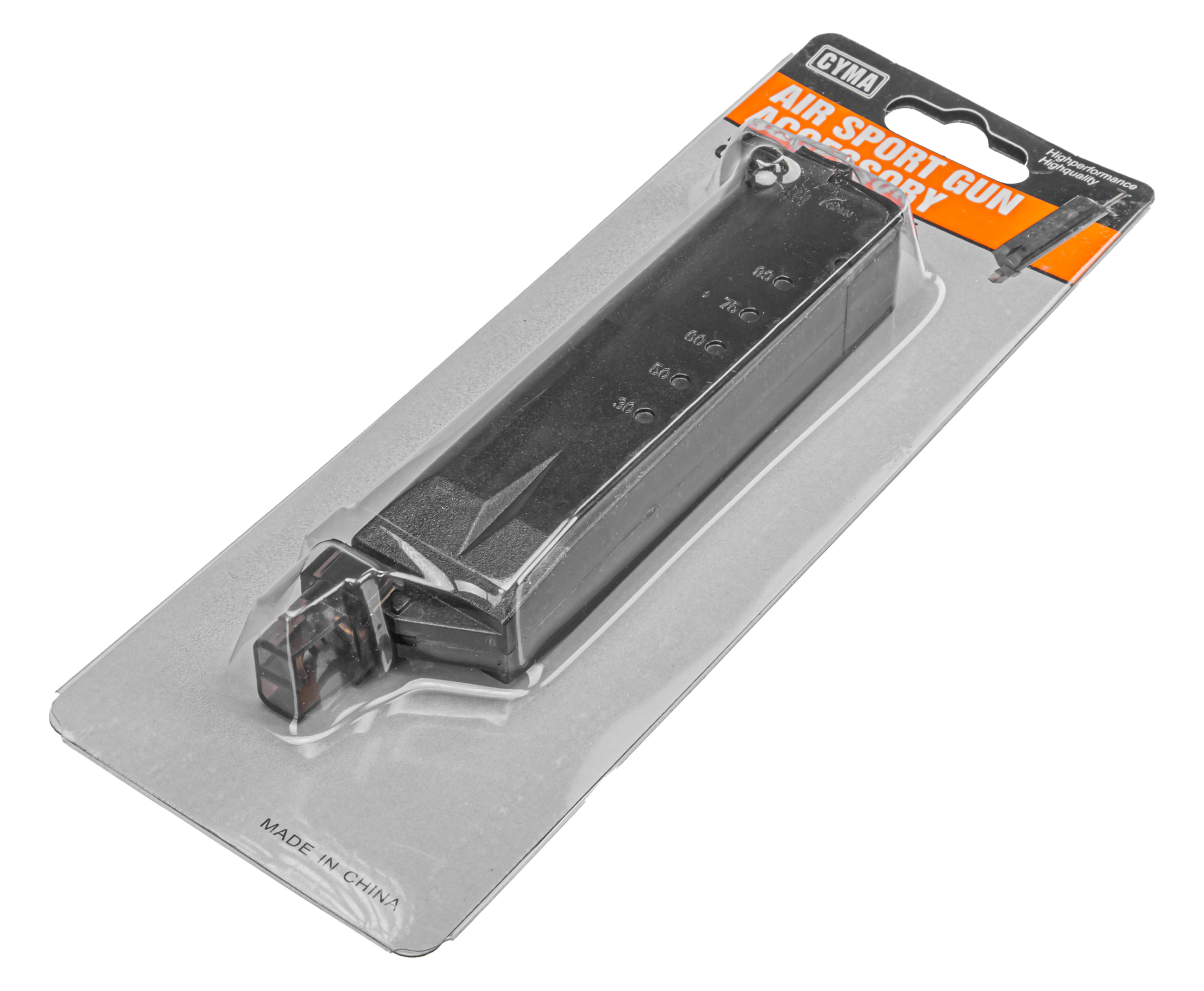 Рассматриваемое изделие представляет собой короб на 100 шаров. Сферические пульки засыпаются внутрь через горловину на пятке, которая прикрыта откидной крышкой. Лоадер Cyma изготавливается из полупрозрачного пластика с отметками на боковой стенке, которые примерно обозначают количество загруженных метаемых элементов.