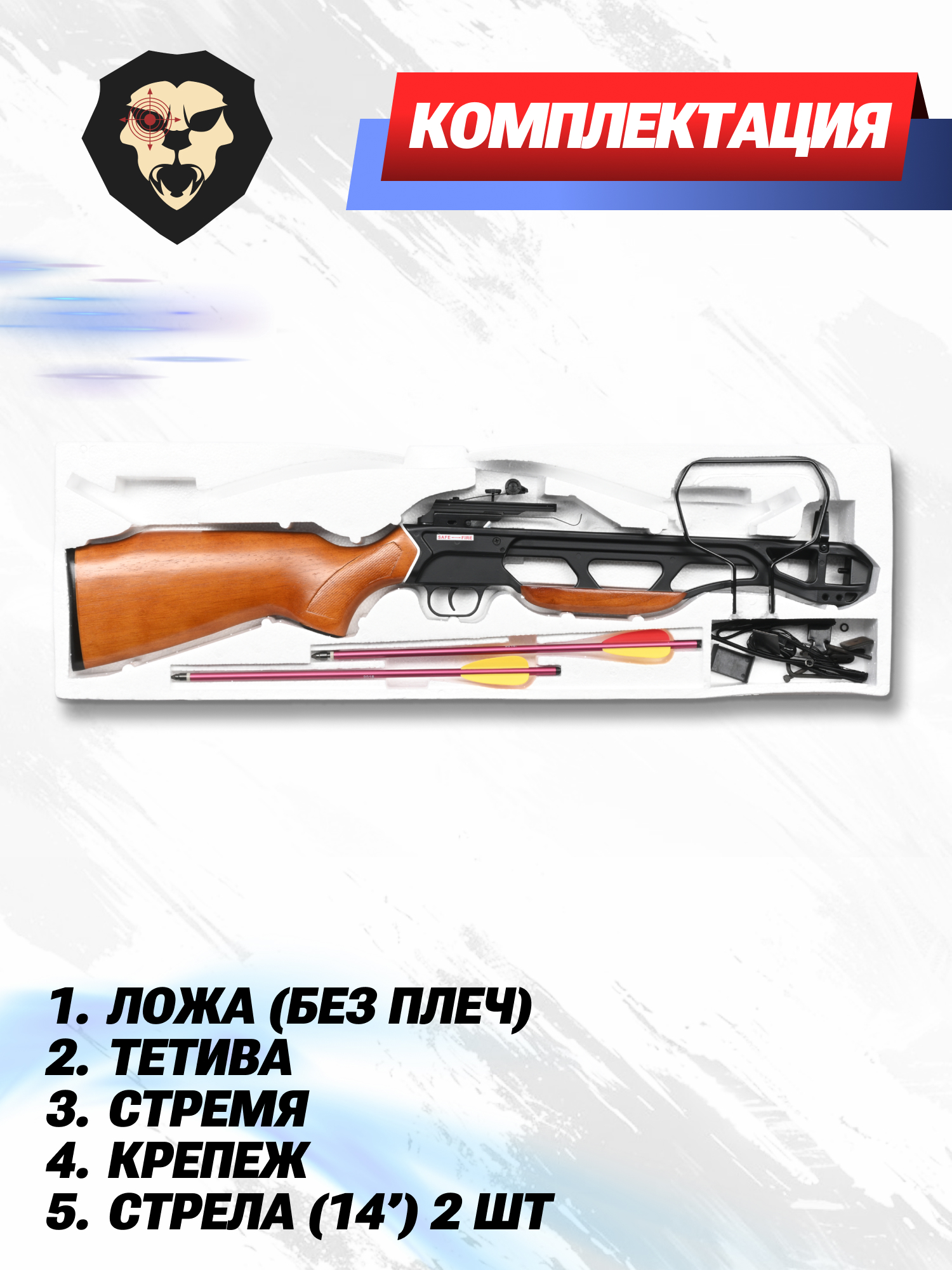| Комплектация | Ложа (без плеч), тетива, стремя, крепеж, стрела 14 дюймов - 2 шт, законцовки, упаковка |