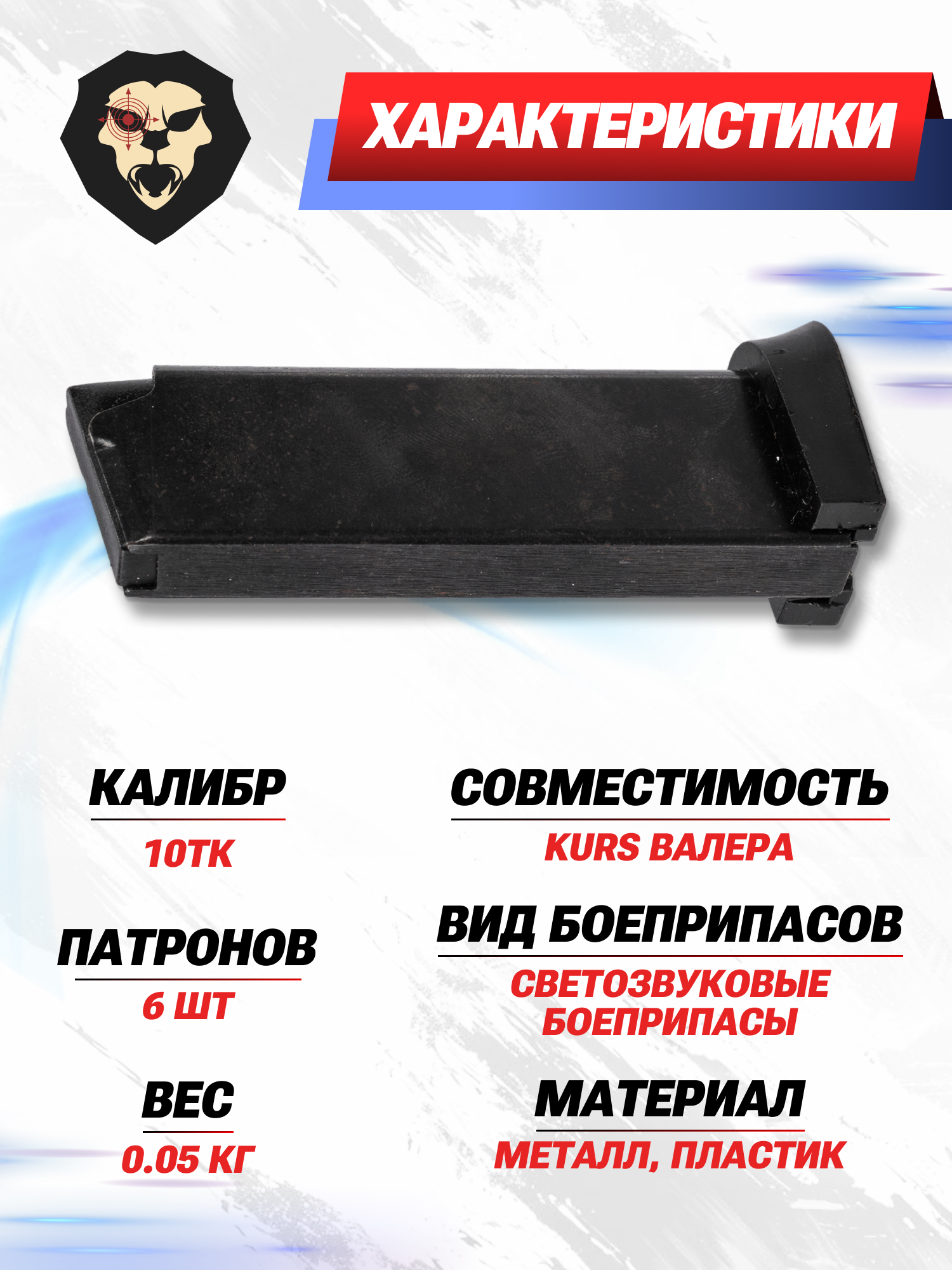 Это изделие предназначено для компактного пистолета Валера. Магазин предполагает заряжание светозвуковыми боеприпасами 10ТК. Для пополнения потребуется отжать подаватель тыльной частью патрона, после чего продвинуть его так, чтобы гильза поджималась удерживающими выступами.