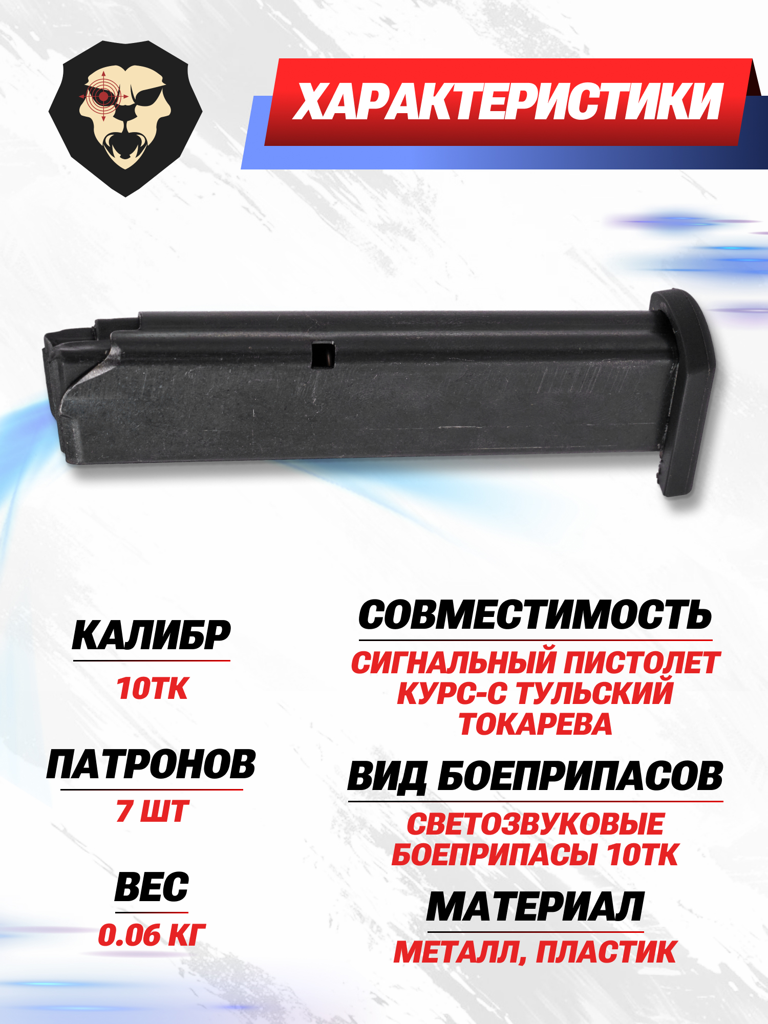 Магазин Kurs снаряжается свето-звуковыми боеприпасами калибра 10ТК от тульского завода ТехКрим. Заявленная емкость идентична штатному элементу питания сигнального пистолета ТТ и составляет 7 патронов - бесперебойное поступление оных в приемник оружия происходит посредством пластикового подавателя, который подпирается тугой пружиной. Пятка также выполнена из полимера и слегка расширена для комфортного извлечения.