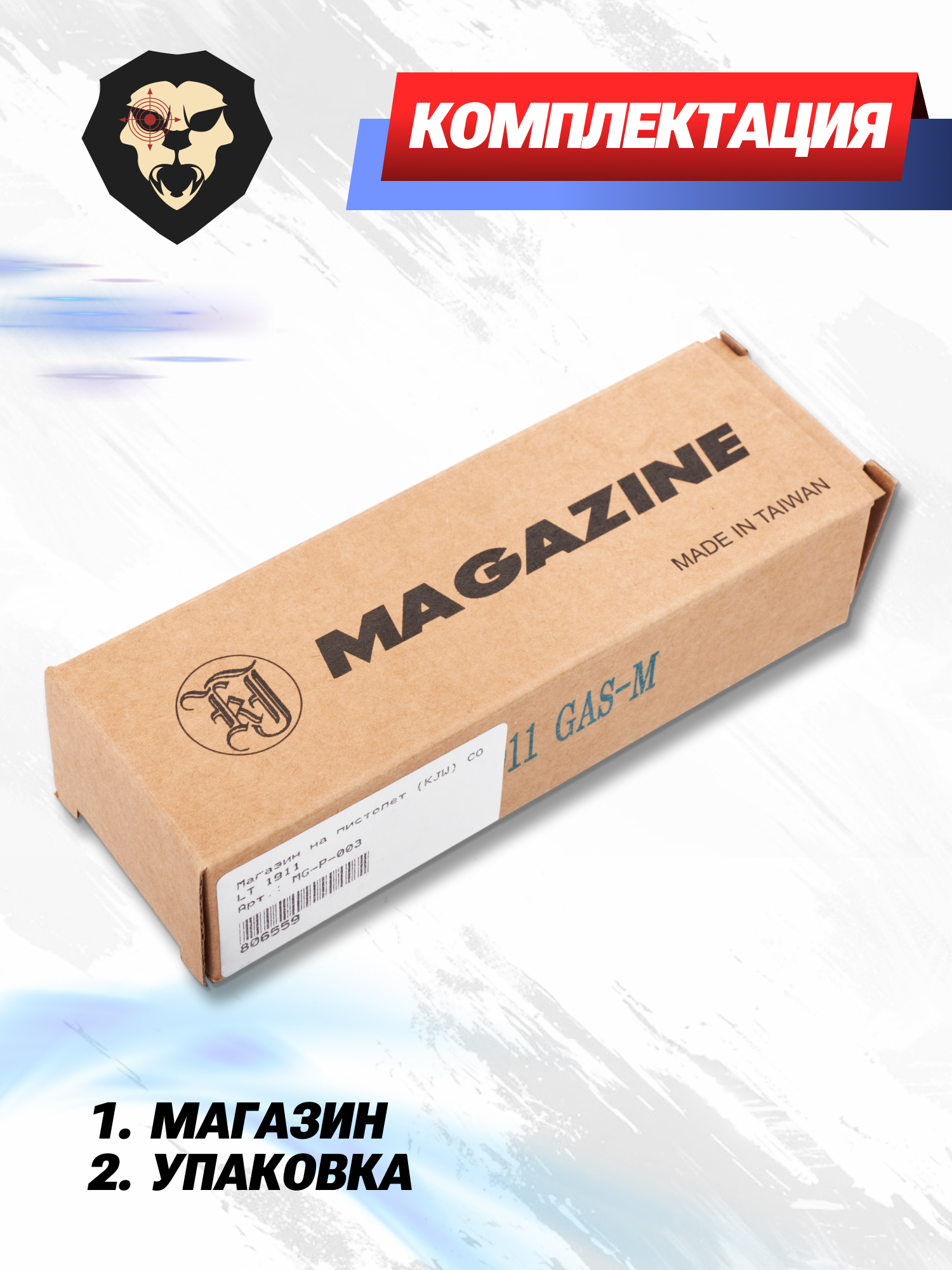 Экземпляр 1911.GAS-M - магазин, работающий на Грин Газ смеси. Это вещество, которое базируется на основе пропана и бутана. Среди достоинств представленного газа принято отмечать сниженную нагрузку на узлы пистолета, что продлит его ресурс.