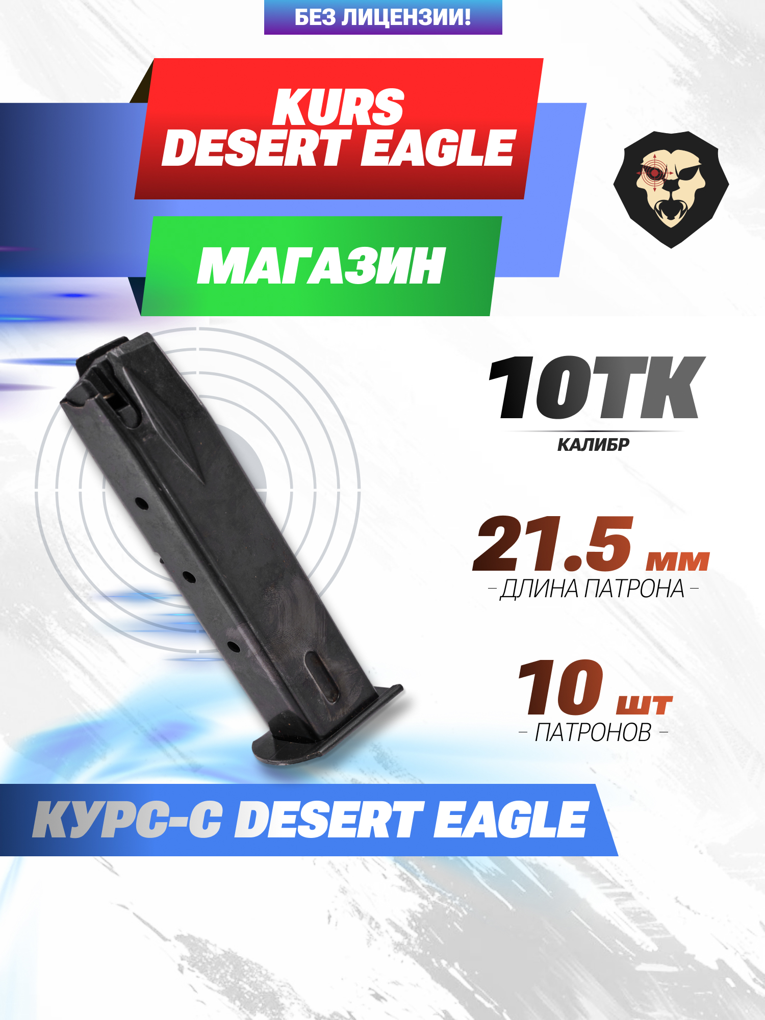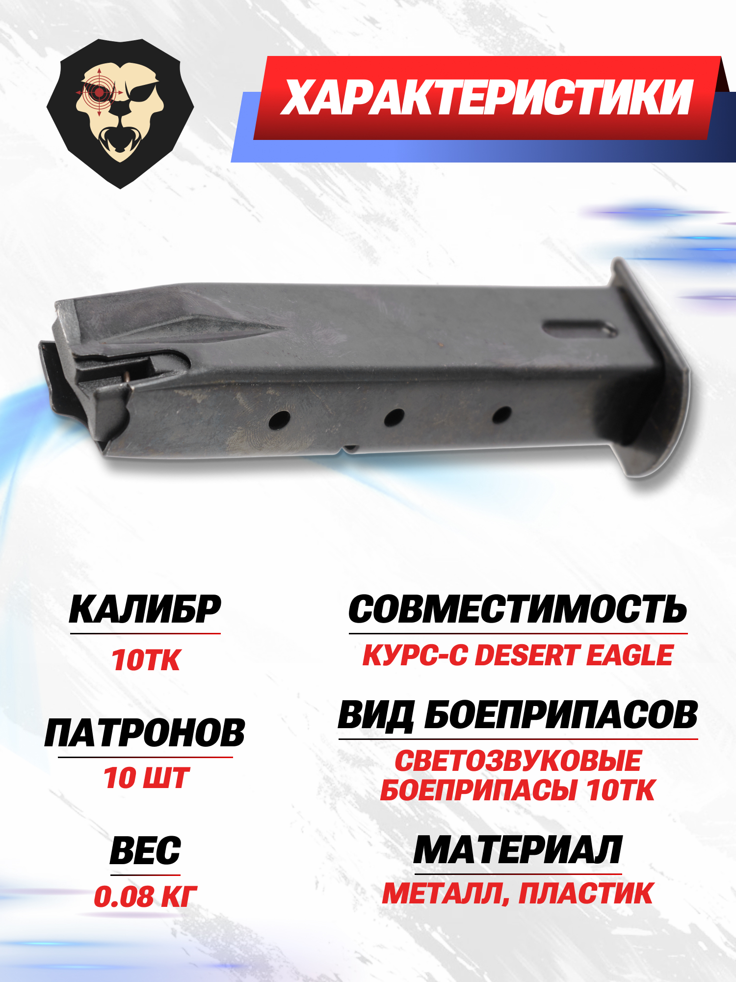 Kurs Desert Eagle магазин рассчитан под специальные боеприпасы калибра 10ТК от завода Техкрим. Они не имеют поражающего элемента и при выстреле образуют яркую вспышку, которая сопровождается громким хлопком. Исходя из этого, работать с СХП рекомендуется в защитных наушниках.