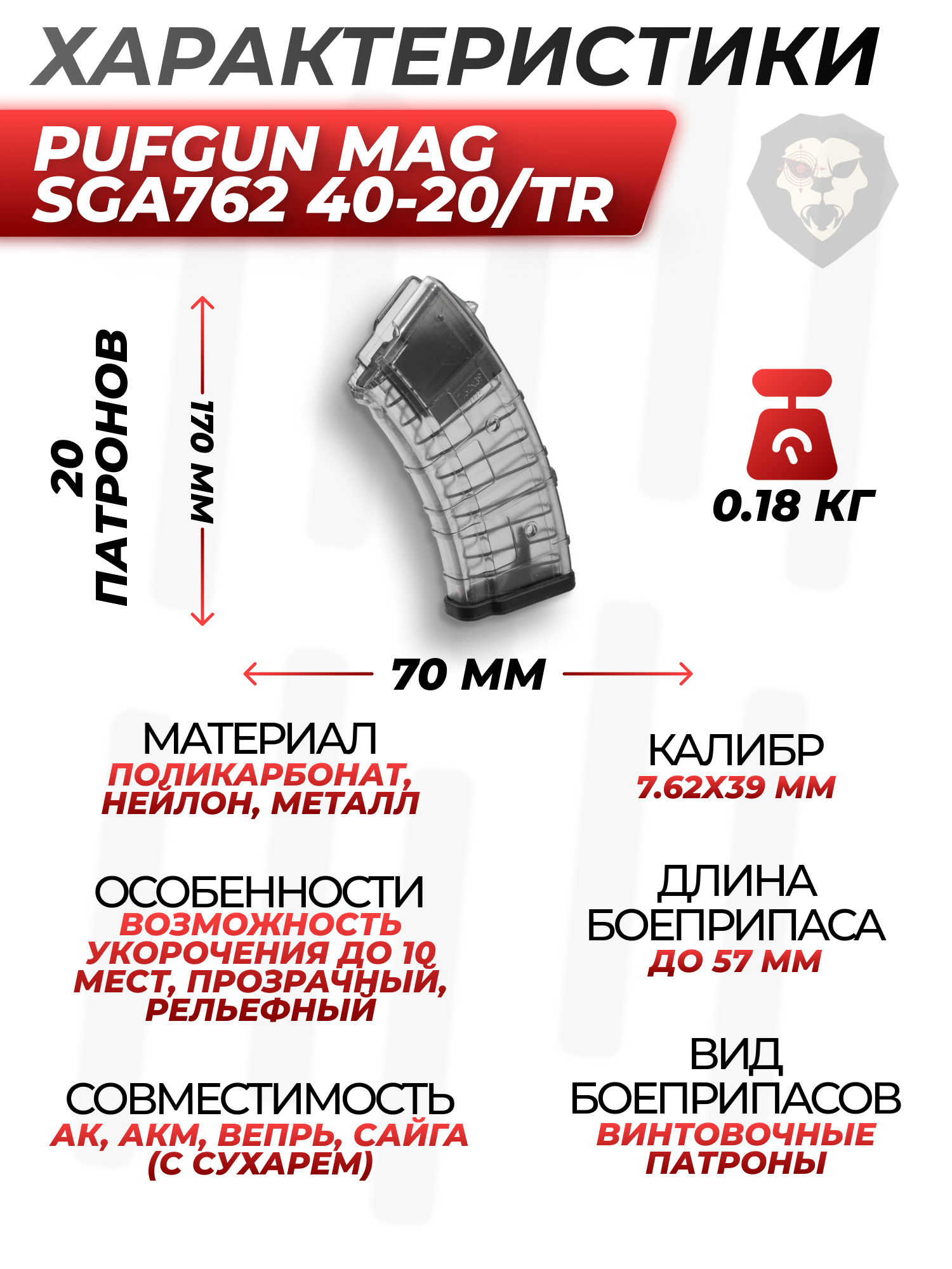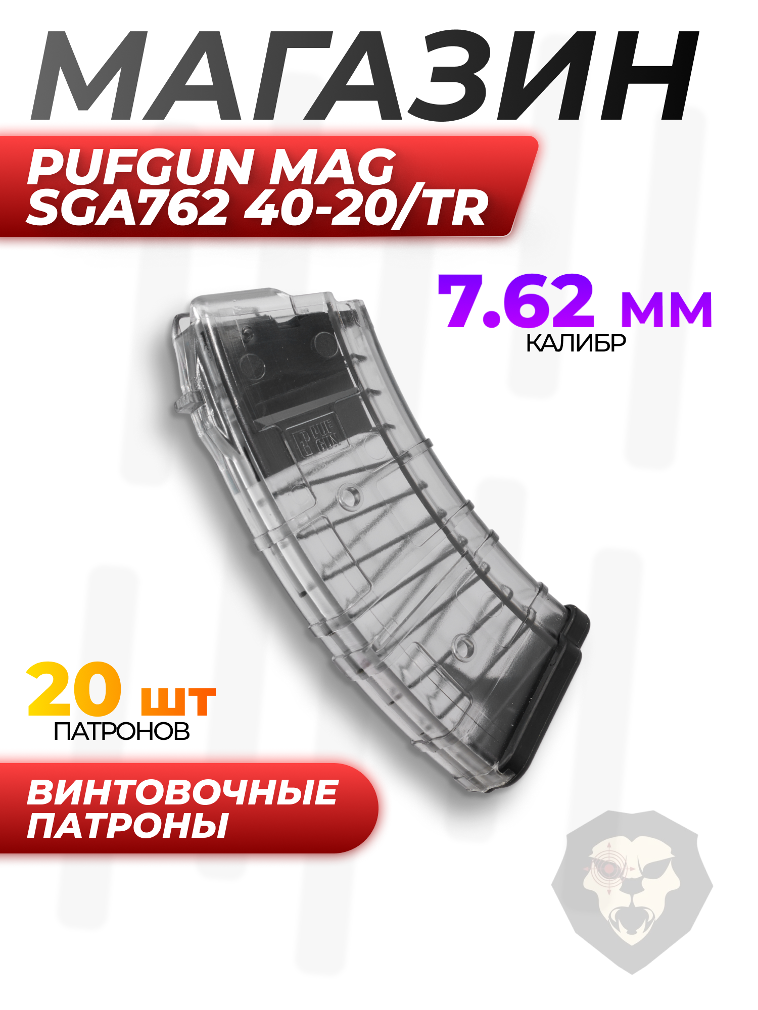 Артикул производителя Mag SGA762 40-20/Tr Магазин PufGun Mag SGA762 40-20/Tr (20 патронов, 7.62х39, АК, с сухарем, прозрачный) по низкой цене 1690 руб. Модель со штрихкодом производителя Вы можете оплатить наложенным платежем с доставкой или в отделении транспортной компании (ПЭК, СДЭК, Boxberry). Ваш заказ со штрихкодом 2000000140117 забрать на почте с оплатой при получении в любой части Российской Федерации.