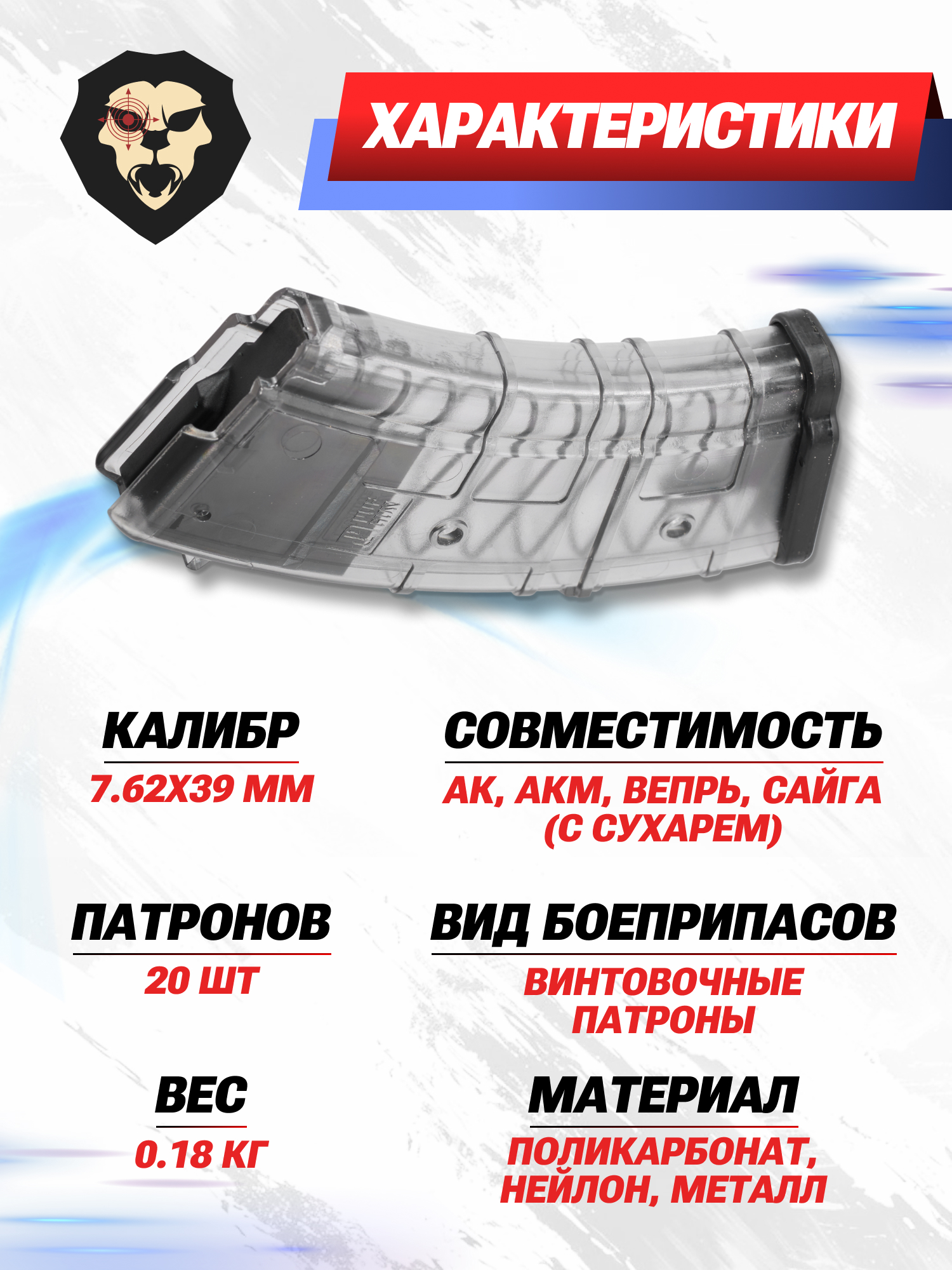В стандартном исполнении экземпляр рассчитан под 20 патронов. Заявлена полная совместимость с автоматами АК-серии и карабинами гражданского пользования типа Вепрь и Сайга калибра .30 Russian, в строении которых предусмотрен сухарь. Указанный узел препятствует утыканию боеприпасов при их подаче.