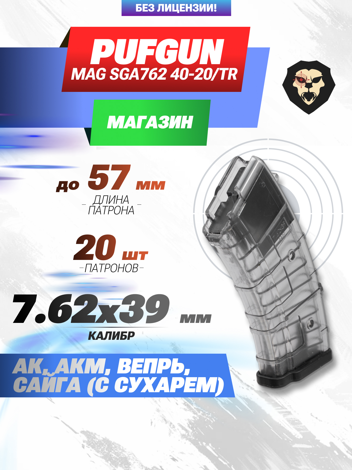 Артикул производителя Mag SGA762 40-20/Tr Магазин PufGun Mag SGA762 40-20/Tr (20 патронов, 7.62х39, АК, с сухарем, прозрачный) по низкой цене 1690 руб. Модель со штрихкодом производителя Вы можете оплатить наложенным платежем с доставкой или в отделении транспортной компании (ПЭК, СДЭК, Boxberry). Ваш заказ со штрихкодом 2000000140117 забрать на почте с оплатой при получении в любой части Российской Федерации.