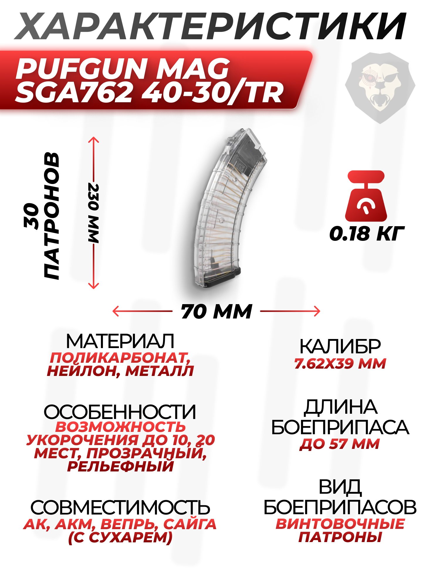 Артикул производителя Mag SGA762 40-30/Tr Магазин PufGun Mag SGA762 40-30/Tr (30 патронов, 7.62х39, АК, с сухарем, прозрачный) по низкой цене 1790 руб. Модель со штрихкодом производителя Вы можете оплатить наложенным платежем с доставкой или в отделении транспортной компании (ПЭК, СДЭК, Boxberry). Ваш заказ со штрихкодом 2000000140148 забрать на почте с оплатой при получении в любой части Российской Федерации.