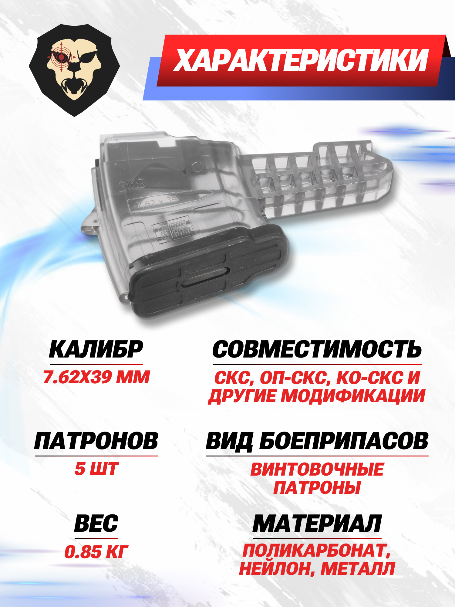 Информация о товаре "Магазин PufGun Mag SKS762 30-5/Tr (СКС, 5 патронов, 7.62х39 мм, прозрачный)" носит ознакомительный характер, и не является публичной офертой, определяемой положениями Статьи 437 Гражданского кодекса Российской Федерации, характеристики, внешний вид, цвет и комплектация могут быть изменены производителем без уведомления.