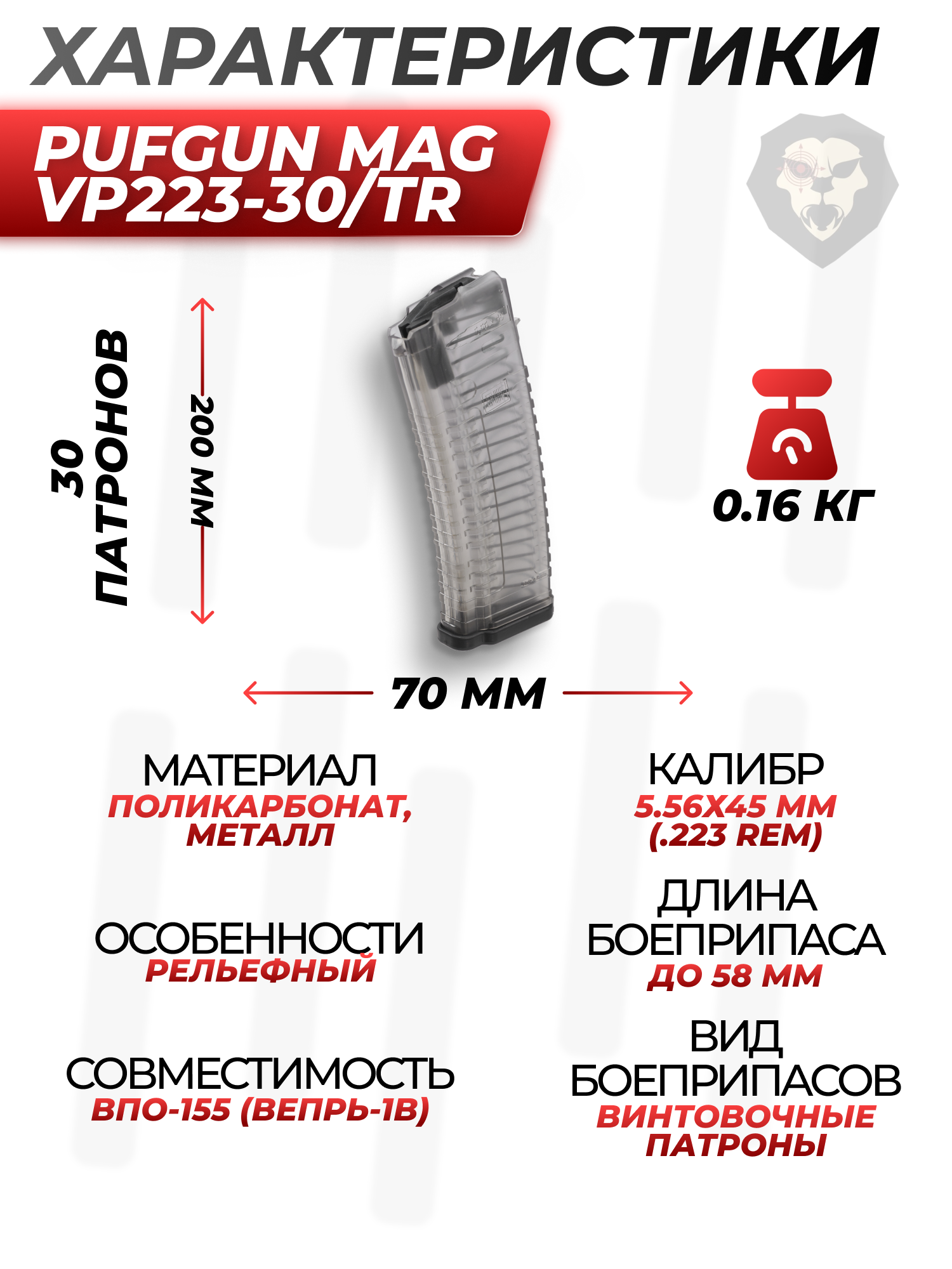 Информация о товаре "Магазин PufGun Mag Vp223-30/Tr (ВПО-155, 30 патронов, 5.56x45 мм, прозрачный)" носит ознакомительный характер, и не является публичной офертой, определяемой положениями Статьи 437 Гражданского кодекса Российской Федерации, характеристики, внешний вид, цвет и комплектация могут быть изменены производителем без уведомления.
