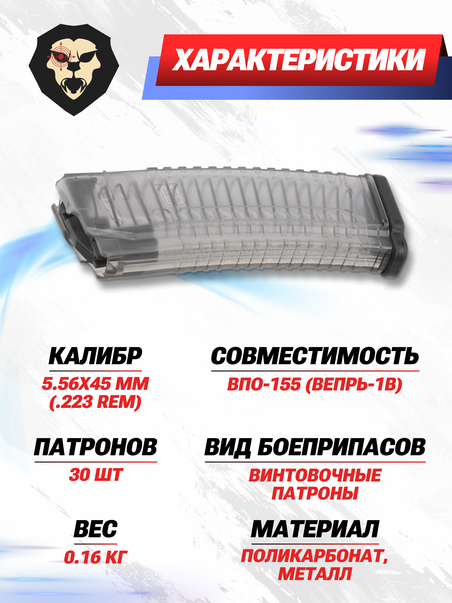 В том числе под модель Вепрь 1В ВПО 155, использующую патроны .223 калибра. Также этот экземпляр может подойти и к близким по конструкции образцам, которые снабжены сухарем. В обозреваемом случае вместимость составила 30 мест.