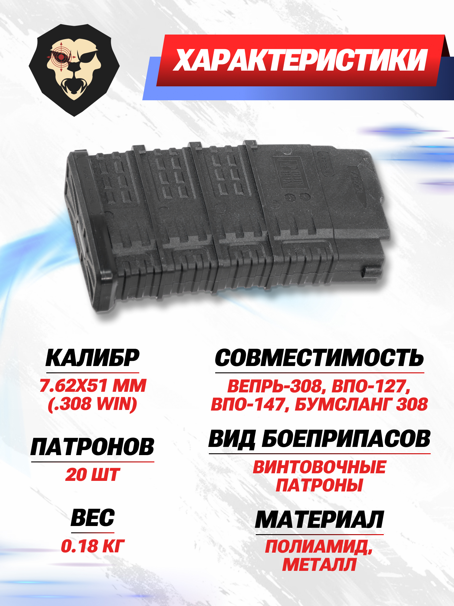 Рассматриваемый магазин предназначен для использования с гражданскими карабинами Вепрь в калибре 7.62x51 мм, например, Вепрь-308, ВПО-127 и ВПО-147. Вместимость описанного изделия рассчитана на установку двадцати патронов, подающихся при стрельбе при помощи штатной пружины. Требуется отметить, что товар не требует доработки перед использованием.