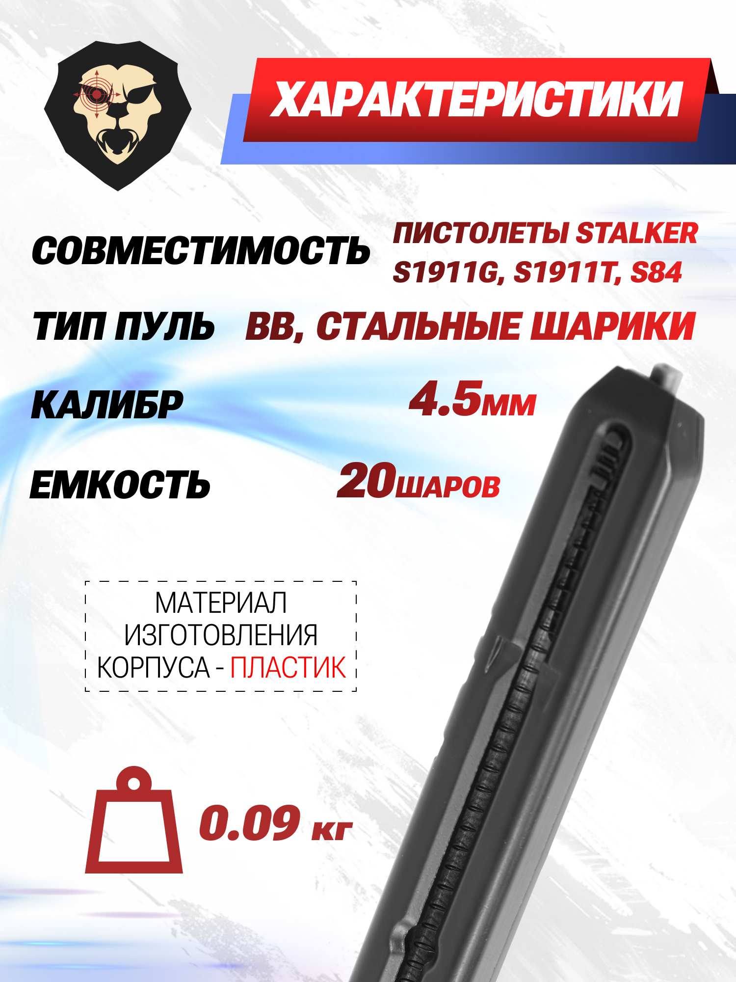 Рассматриваемый экземпляр предназначается для использования совместно с газобаллонными пневматическими пистолетами Сталкер модельного ряда S1911G, S1911T и S84. Их особенность заключается в раздельном расположении сменной емкости с CO2 и магазина - следовательно, последний имеет сокращенные габариты и небольшую массу.
