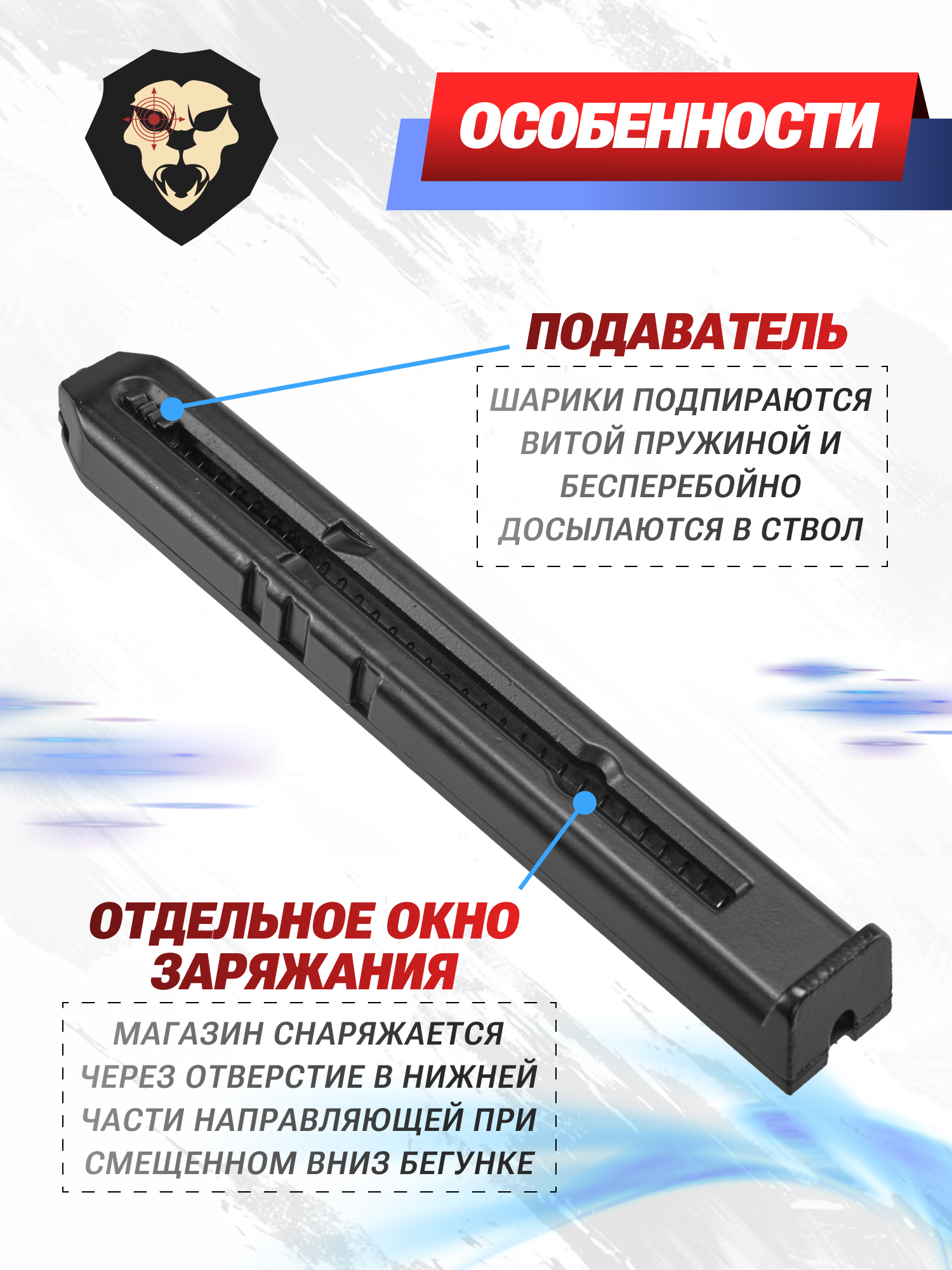 Конструкция узла предполагает заряжание через специальное отверстие во фронтальном окне - пользователю потребуется отвести подаватель магазина Сталкер до конца и наполнить канал шариками калибра 4.5 миллиметра. После этого ползунок можно отпустить. Такая схема помогает сберечь ресурс подающей части.