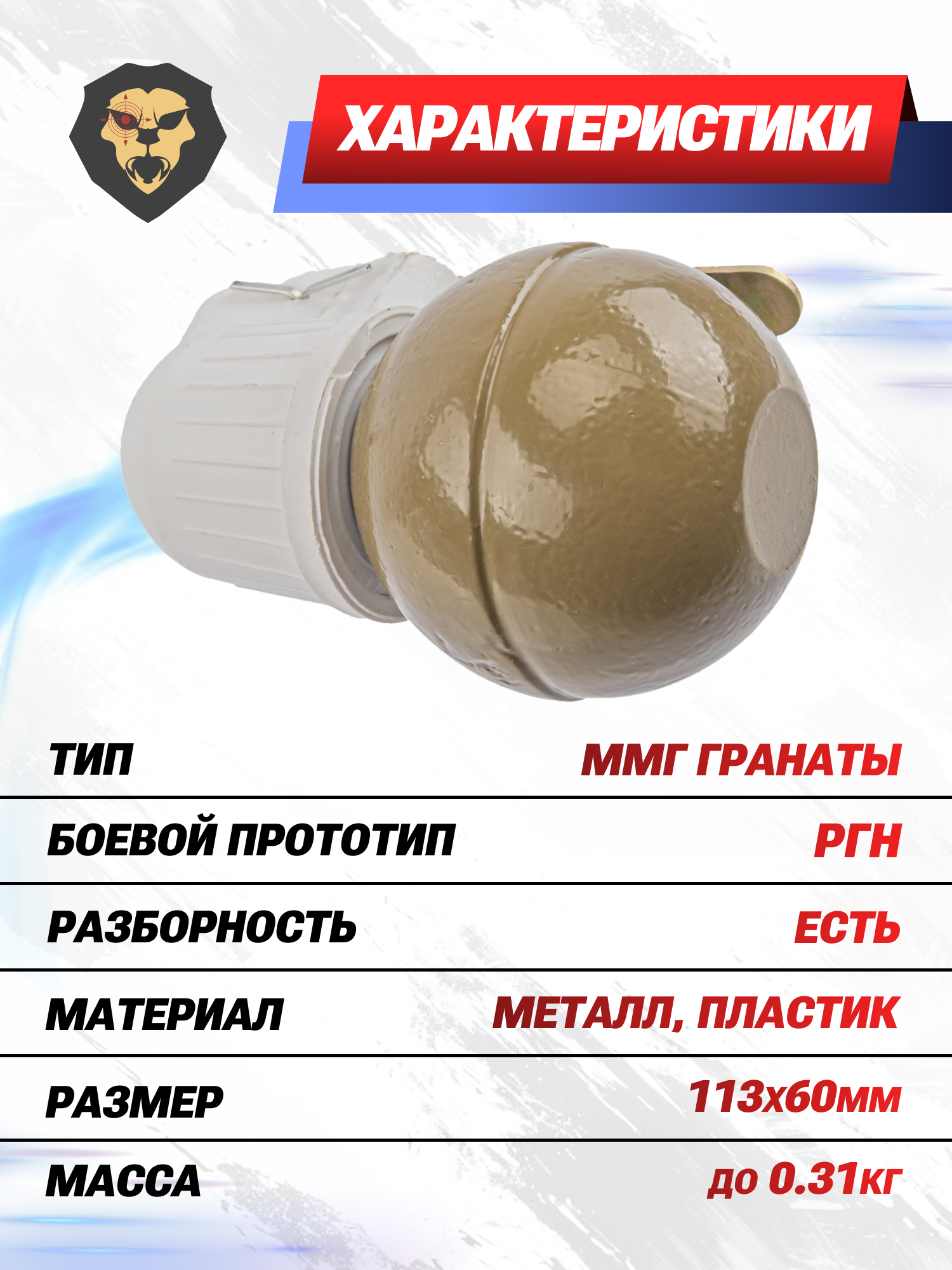 Информация о товаре "ММГ граната РГН (макет, учебная)" носит ознакомительный характер, и не является публичной офертой, определяемой положениями Статьи 437 Гражданского кодекса Российской Федерации, характеристики, внешний вид, цвет и комплектация могут быть изменены производителем без уведомления.
