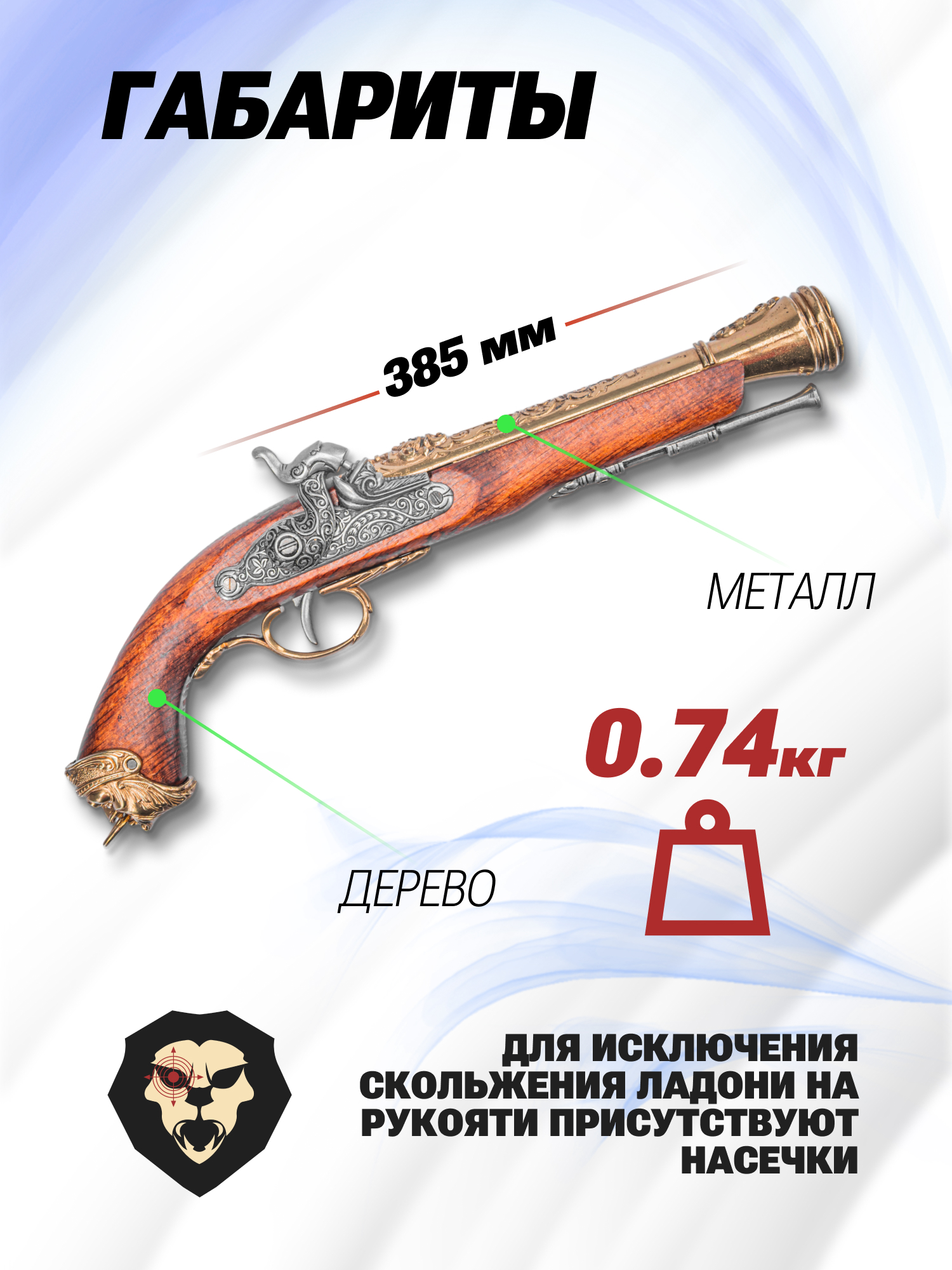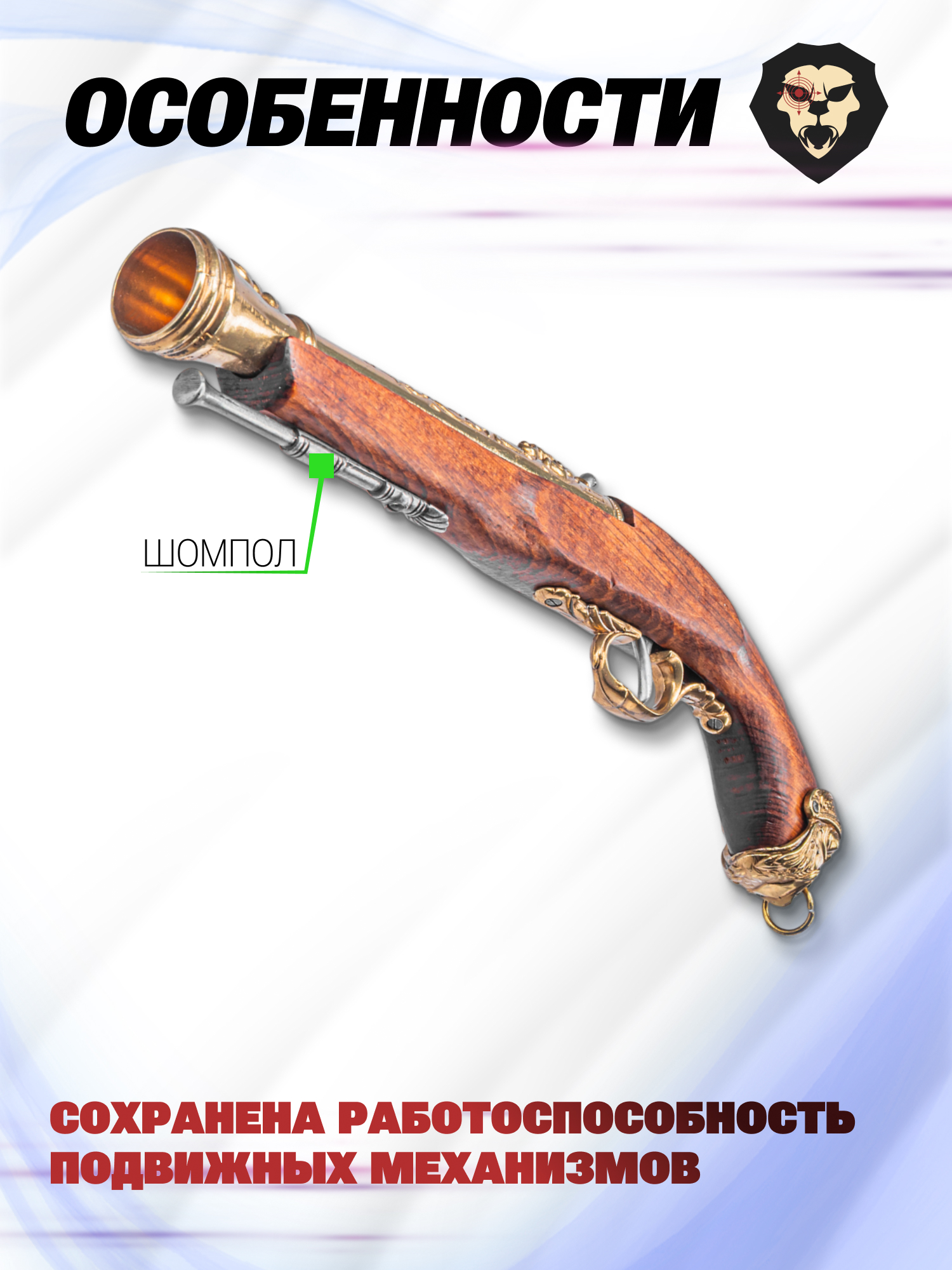 Поверхности этих деталей оформили художественной гравировкой, а также придали им два цвета - классический серый оттенок оружейного металла и латунный, что вкупе сделало внешность оружия более привлекательной. Для дополнительного раскрытия эффекта изготовитель Denix выполнил ложу из натуральной древесины, без чего бы не вышло добиться аутентичного рисунка на ее поверхности. Текстура подчеркнута лаком, вместе с чем он также защищает поверхность от намокания.
