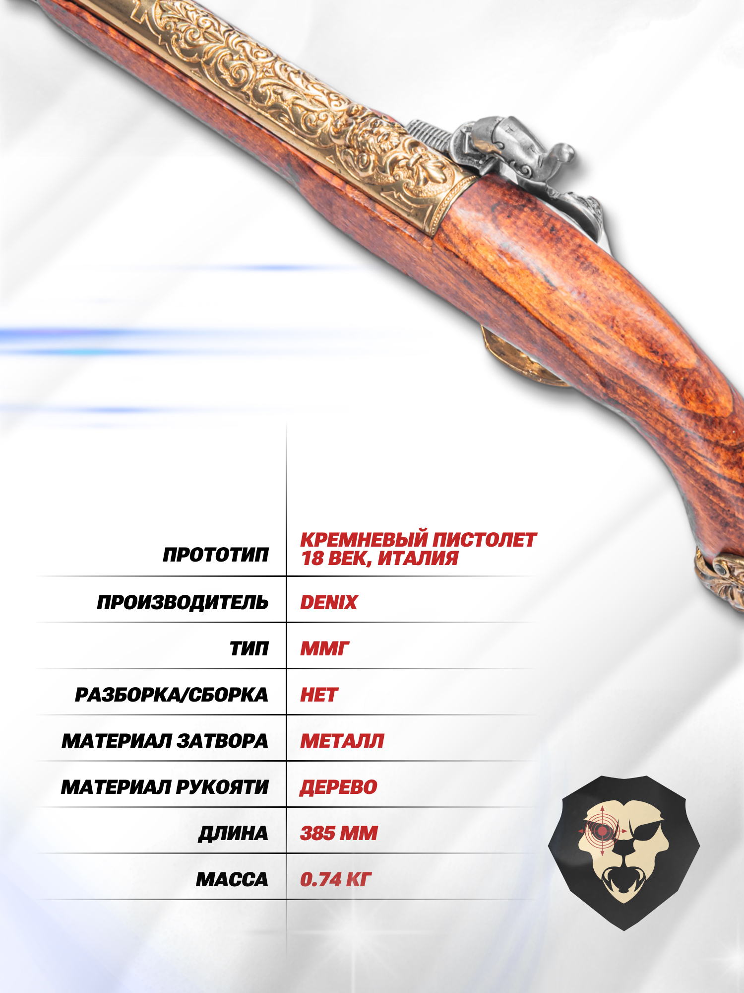 Информация о товаре "Макет кремниевого пистолета Denix D7/1104L (18 век, Италия, латунь)" носит ознакомительный характер, и не является публичной офертой, определяемой положениями Статьи 437 Гражданского кодекса Российской Федерации, характеристики, внешний вид, цвет и комплектация могут быть изменены производителем без уведомления.