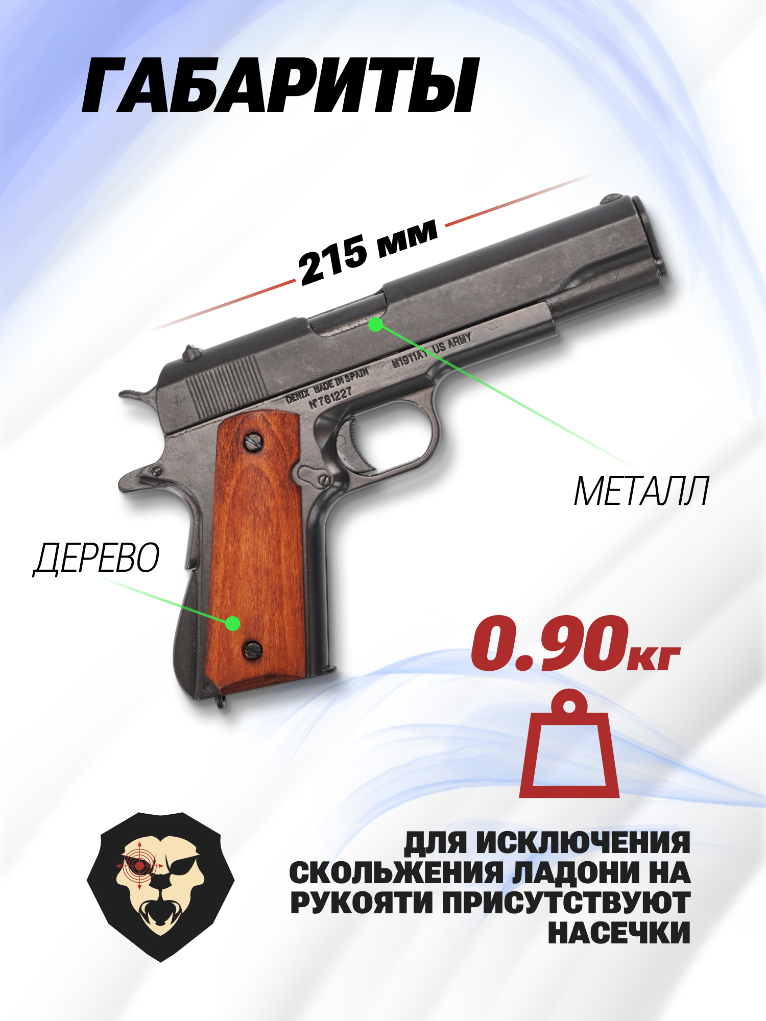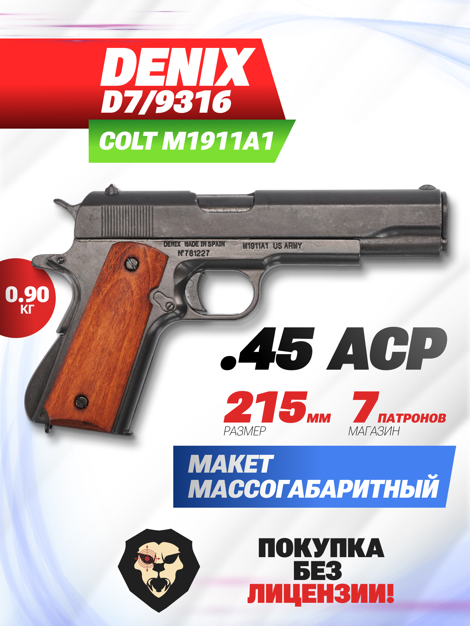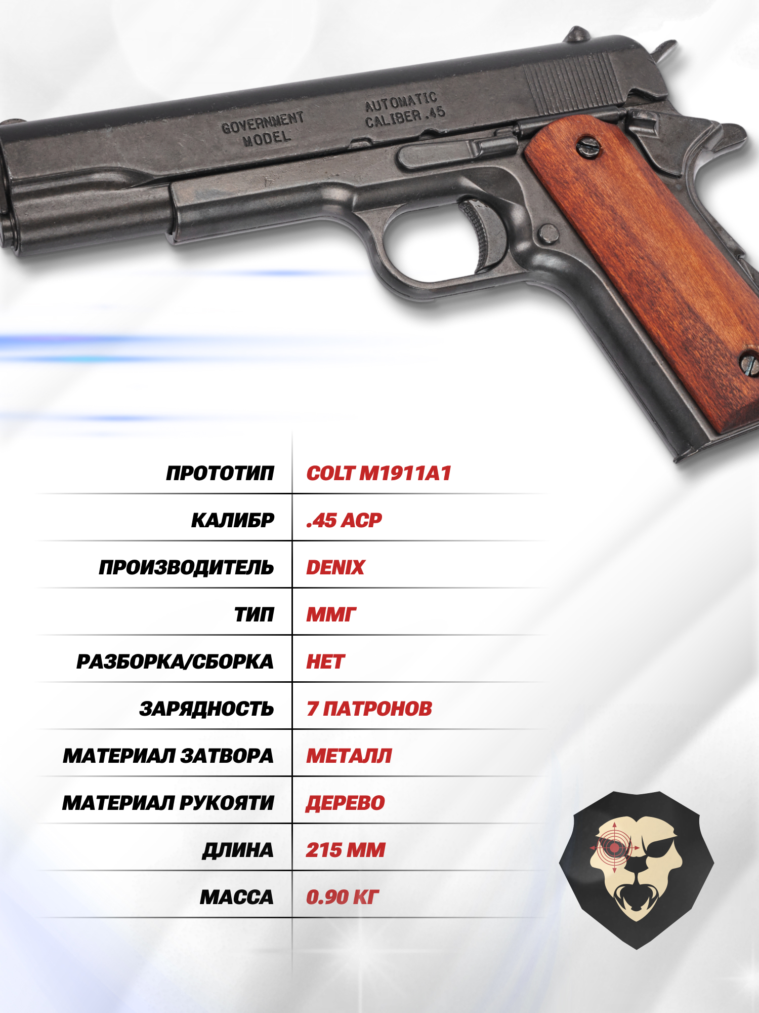 Описываемый массогабаритный макет Denix Colt M1911A1 изготавливается из прочного металлического сплава, за счет чего модель имеет приближенный к прототипу вес в 905 грамм при длине конструкции 215 миллиметров. При этом, рукоять оснащается накладками из натурального дерева, что в сочетании с конструкцией корпуса формирует привлекательный внешний вид классического пистолета.