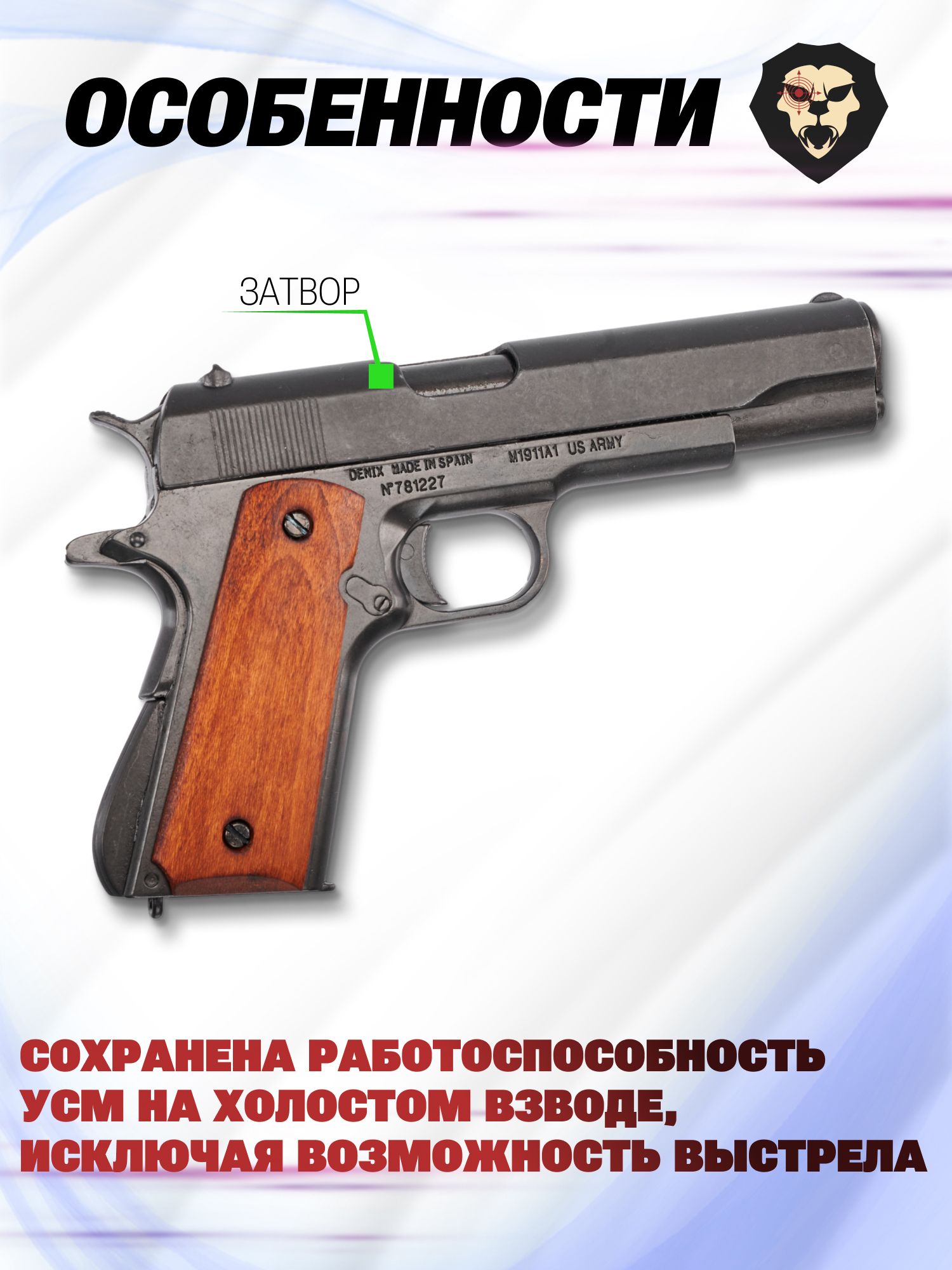 Обозреваемая модель, выпущенная испанской компанией Denix, представляет собой макет самого узнаваемого американского пистолета конструкции Браунинга – Colt 1911. Рассматриваемый образец с высокой детализацией повторяет модификацию M1911A1, выпущенную в 1926 году.