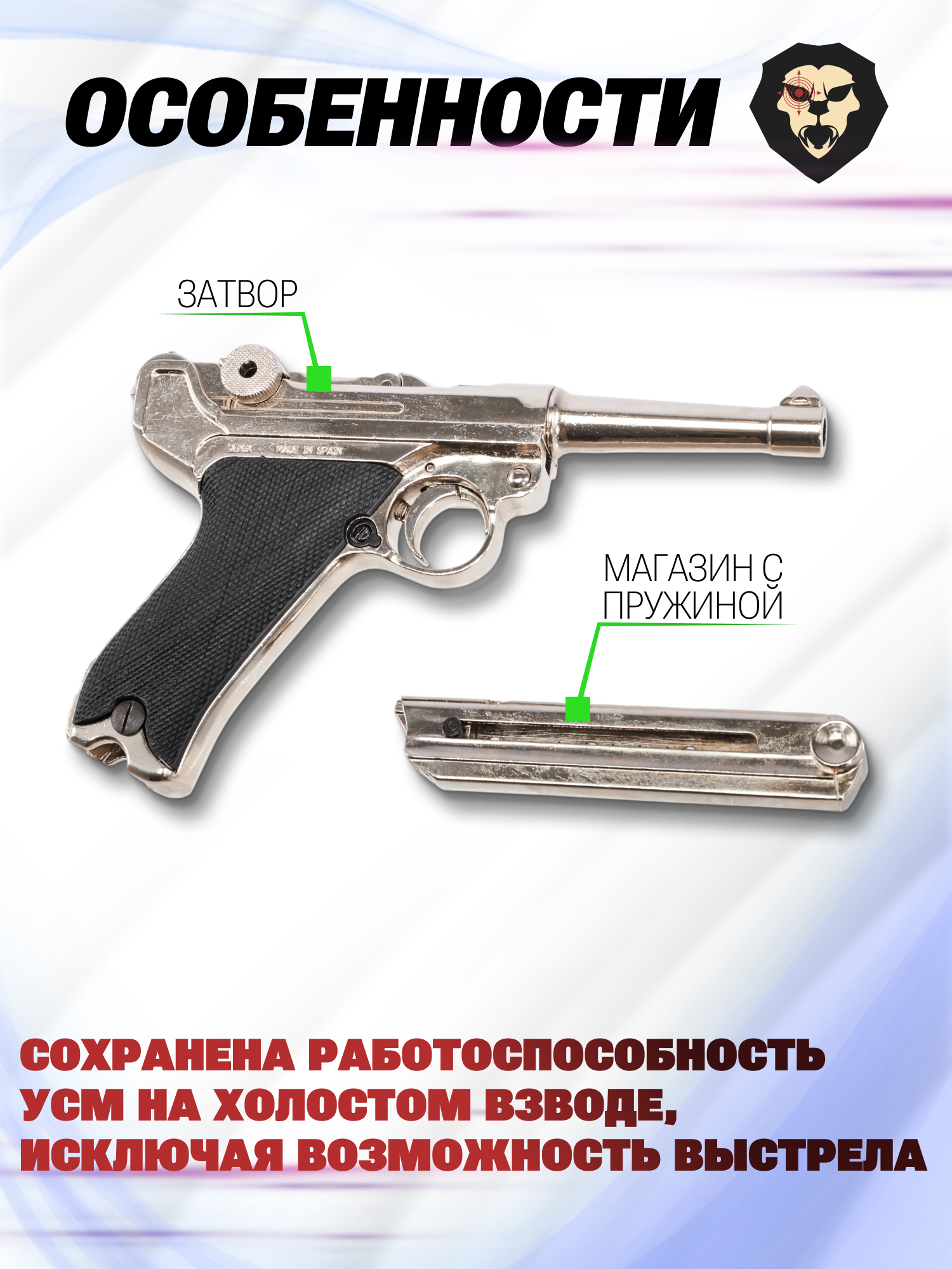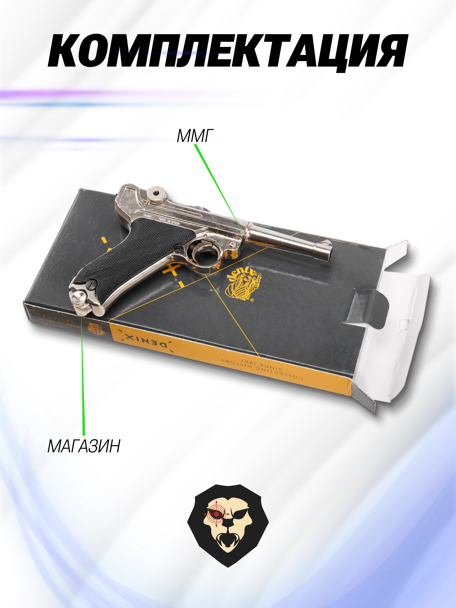 Информация о товаре "Макет пистолета Denix D7/8143 Luger P08 (ММГ, Германия, 1898 г, никель)" носит ознакомительный характер, и не является публичной офертой, определяемой положениями Статьи 437 Гражданского кодекса Российской Федерации, характеристики, внешний вид, цвет и комплектация могут быть изменены производителем без уведомления.