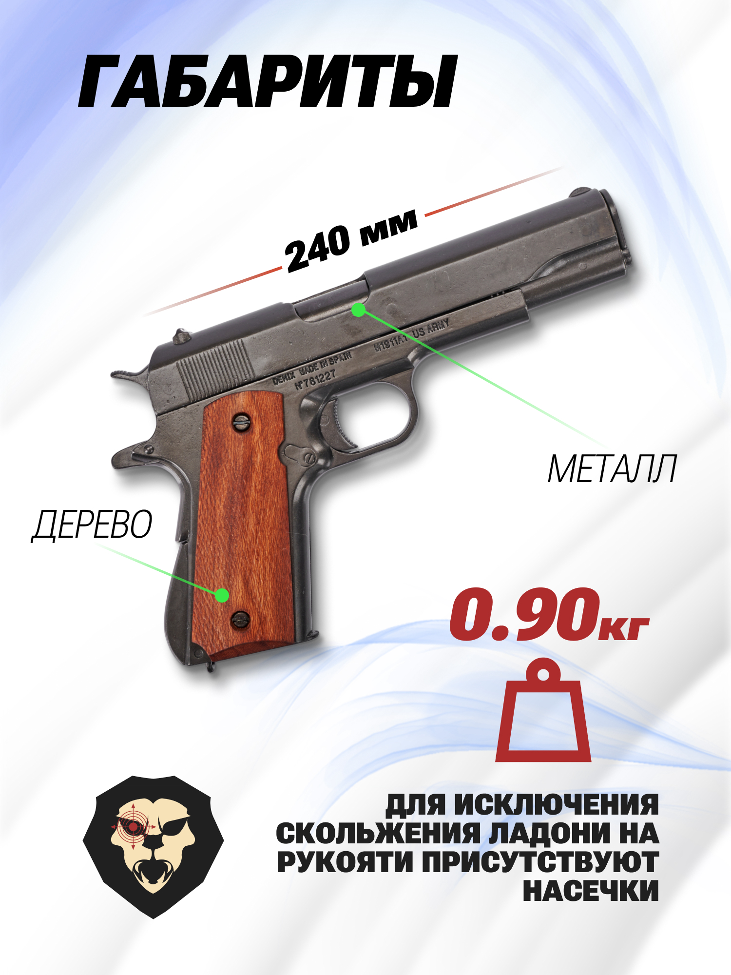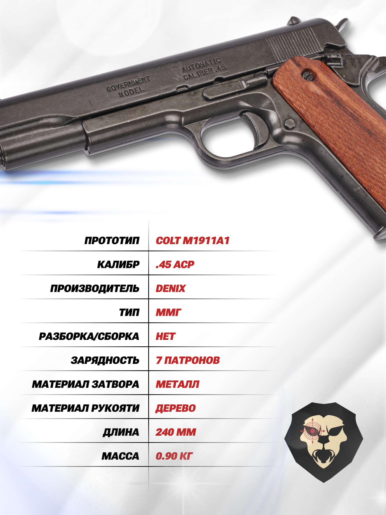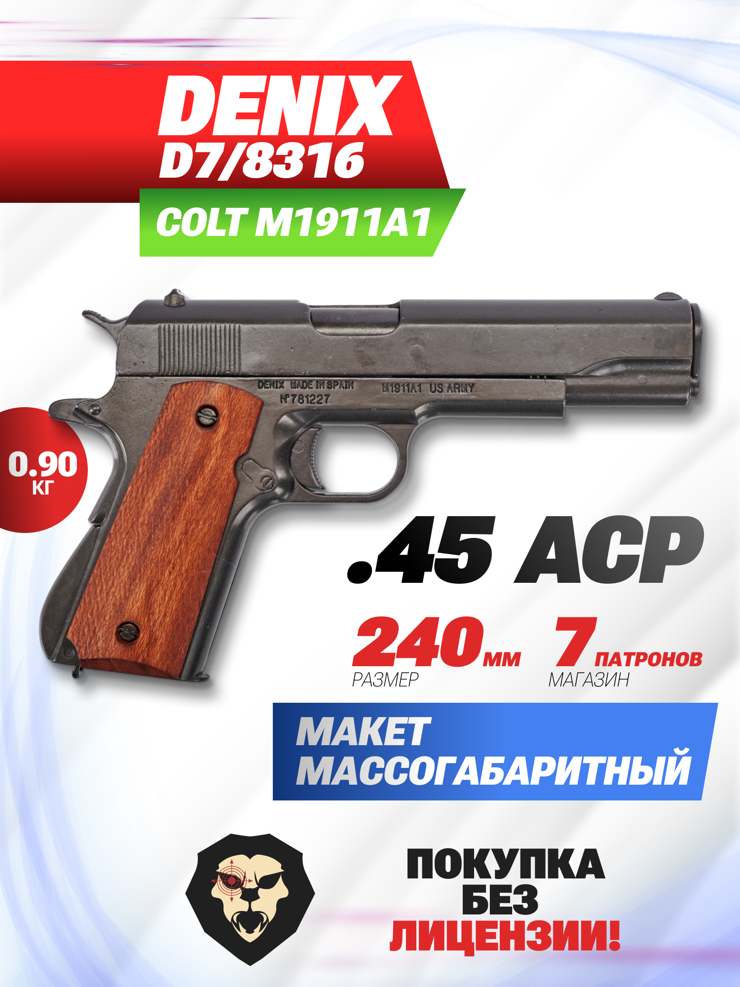 Информация о товаре "Макет пистолета Denix D7/8316 Colt 1911A1 (ММГ, Кольт)" носит ознакомительный характер, и не является публичной офертой, определяемой положениями Статьи 437 Гражданского кодекса Российской Федерации, характеристики, внешний вид, цвет и комплектация могут быть изменены производителем без уведомления.