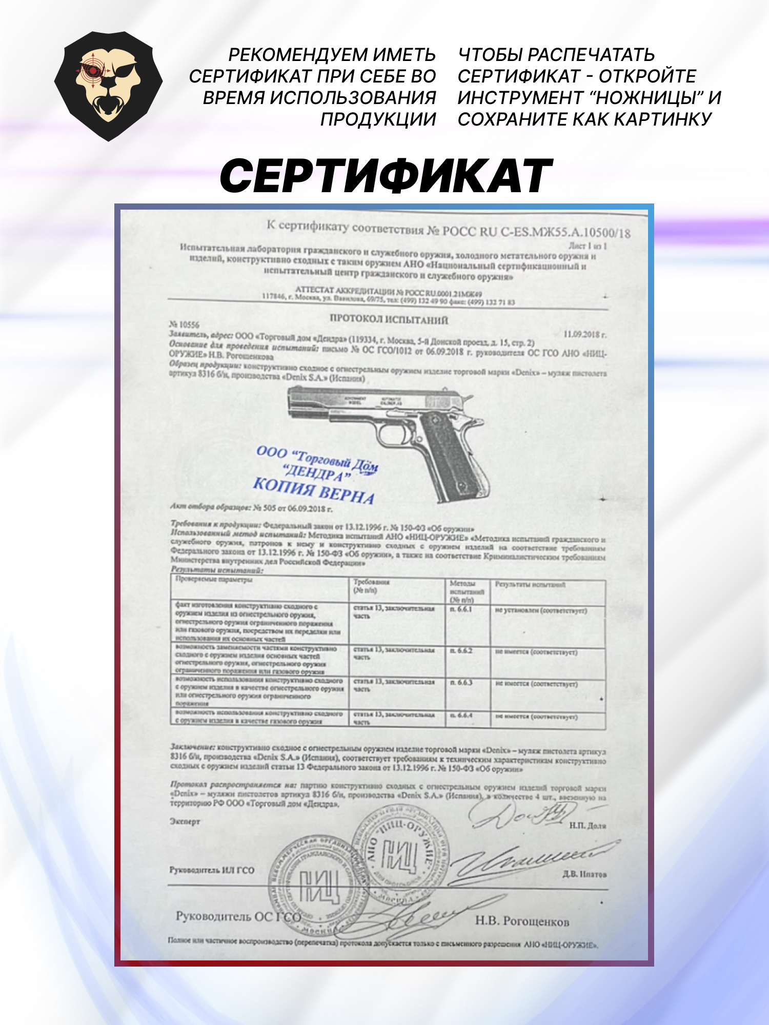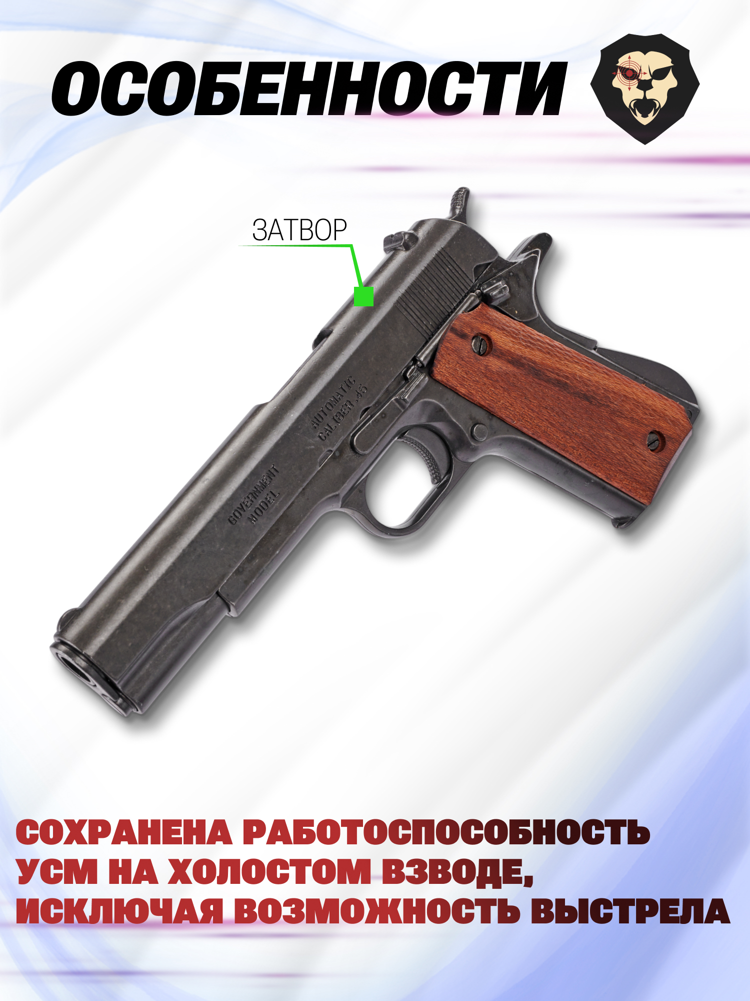 Образец неразборный и не рассчитан на ведение огня боевыми или холостыми патронами, по причине чего экземпляр определен в категорию макетов. Соответственно для владения Кольтом не потребуются специальные условия и лицензия - достаточно того факта, что покупателю исполнилось 18 лет.