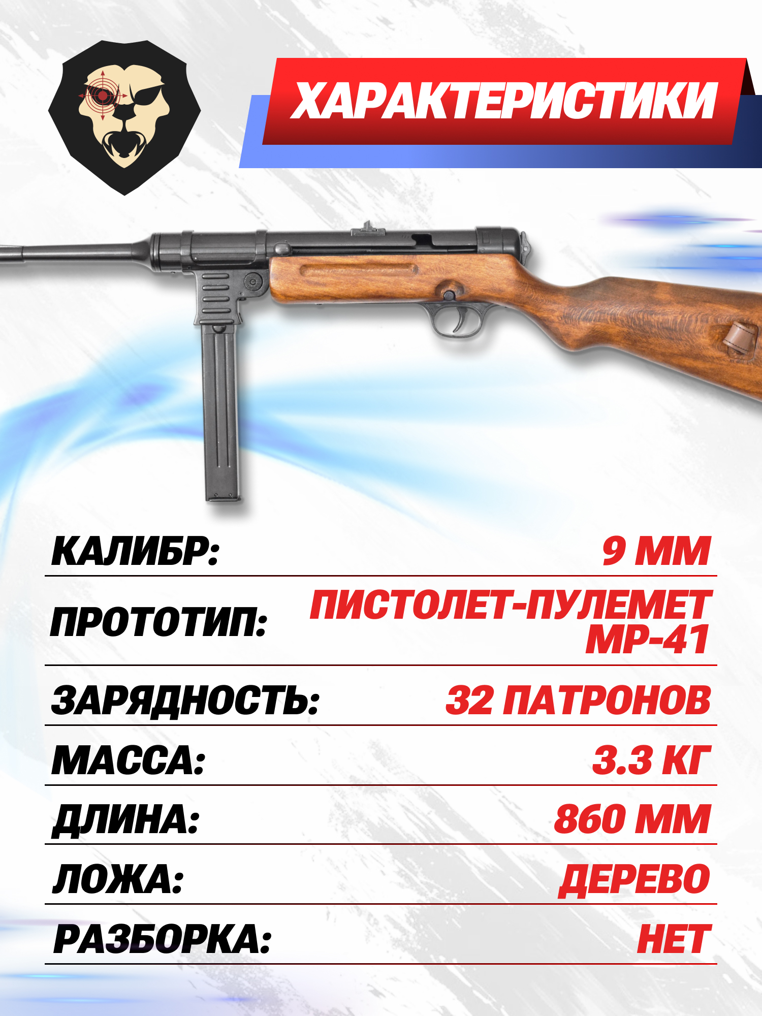 Пистолет пулемет MP 41 оснащался деревянным прикладом - мастера фирмы Denix воспроизвели эту особенность в собственном макете. Габариты совпадают с боевым прототипом - длина модели составляет 86 сантиметров. За счет применения современного сплава при изготовлении ствола, коробки и органов управления масса макета не превышает 3.13 кг.