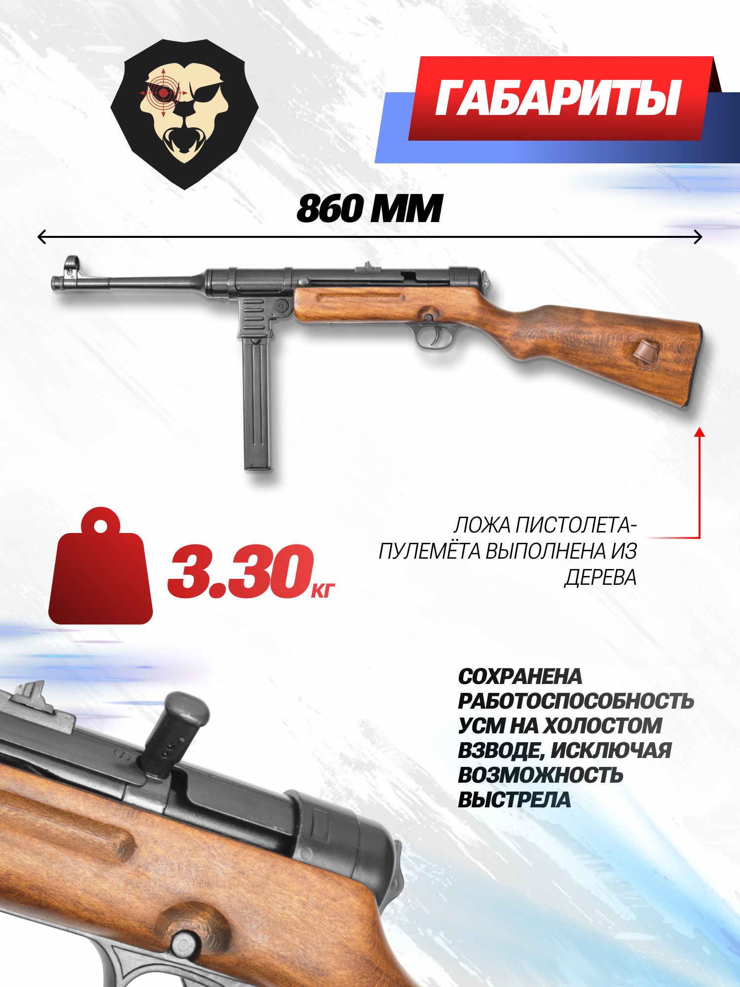 Наведение осуществлялось механическими приспособлениями в виде мушки и целика. Макет неразборный, ввиду чего его конструкция выделяется повышенной прочностью и отсутствием люфта деталей. В комплекте с изделием идет кожаный ремень для ношения на плече во время военно-патриотических реконструкций и других тематических мероприятий.