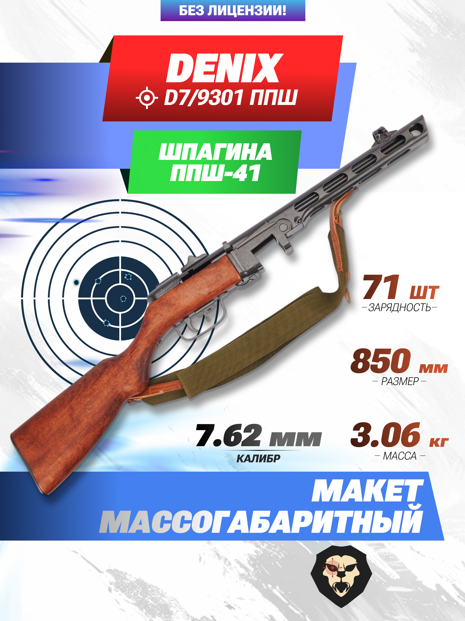 Макет фирмы Denix не предрасполагает к стрельбе, ввиду чего для его покупки разрешение не требуется. При этом изделие в мельчайших деталях воспроизводит боевой прототип и соответствует его габаритам - длина рассматриваемой версии составляет 85 сантиметров. ММГ вариация ППШ отлично дополнит реконструируемый образ для участия в военно-патриотических мероприятиях, а также фотосессиях.