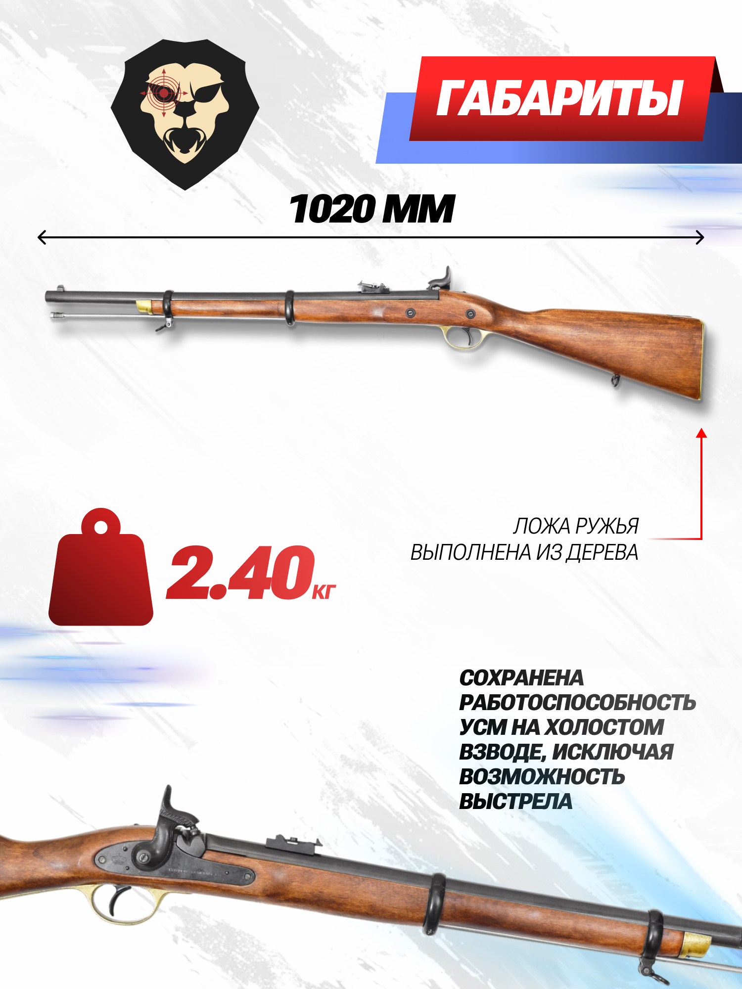 К перечню товаров бренда относится обозреваемая массогабаритная копия английского ружья Enfield образца 1860 года в компактной версии исполнения со стволом, длина которого составляет 610 миллиметров. Указанная модификация огнестрельного прототипа предназначалась для вооружения кавалеристов с целью сохранить их мобильность на поле боя.