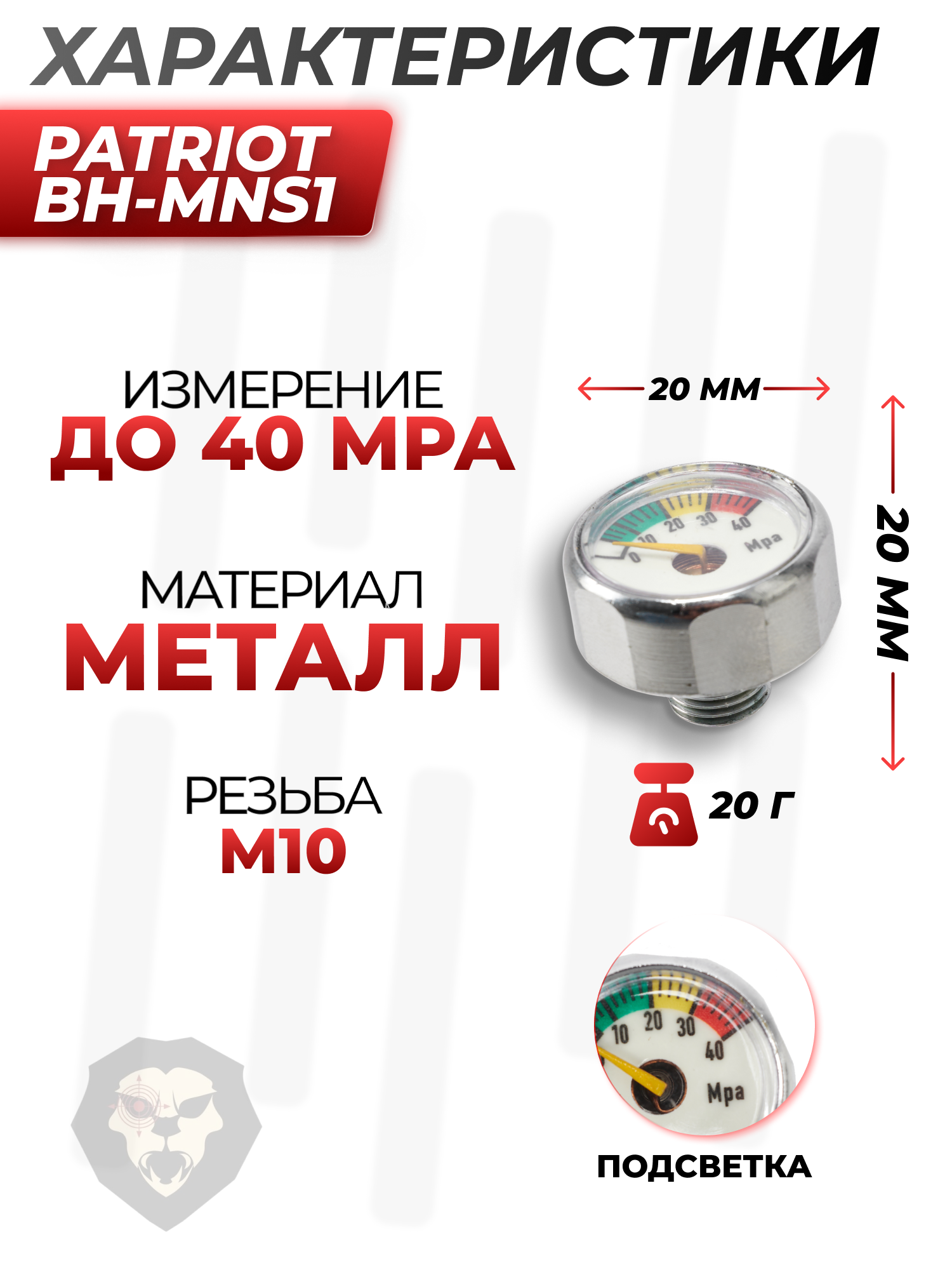 Чтобы использовать пневматическое оружие с резервуаром для закачки воздуха в это устройство монтируются приспособления, измеряющие уровень давления, нагнетающийся газом внутри. Приспособления такого типа называются манометрами и изготавливаются китайской компанией Patriot. Расширяя ассортимент, компания представила новые манометры для PCP винтовок Patriot BH-MNS1.