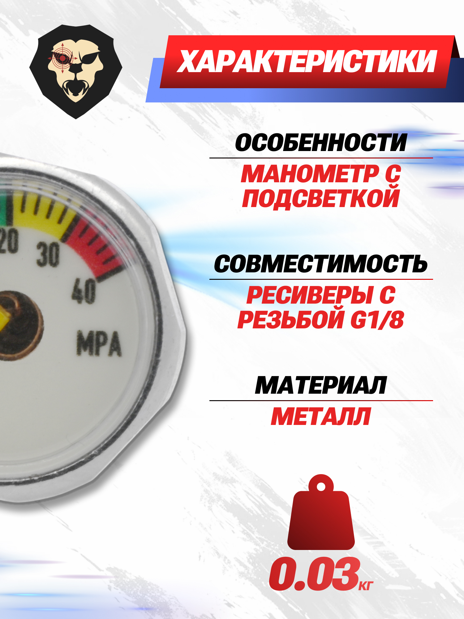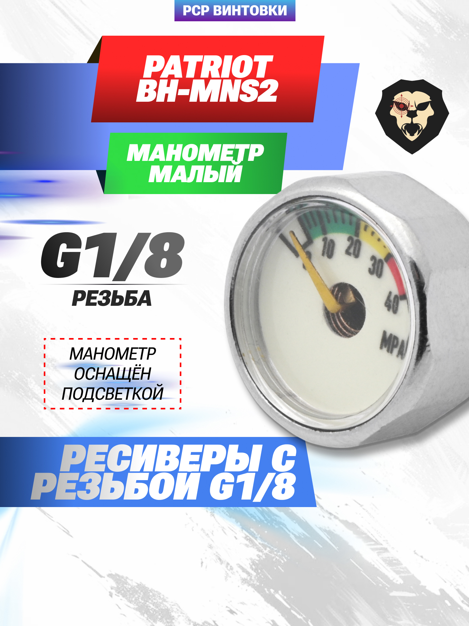 Манометр Патриот модели BH-MNS2 предназначен для установки в резервуар или ствольную коробку пневматики, а также в средства ее заправки. Диаметр 25 миллиметров позволит разместить устройство даже в небольших пистолетных ресиверах. Прибор предполагает крепление G1/8.
