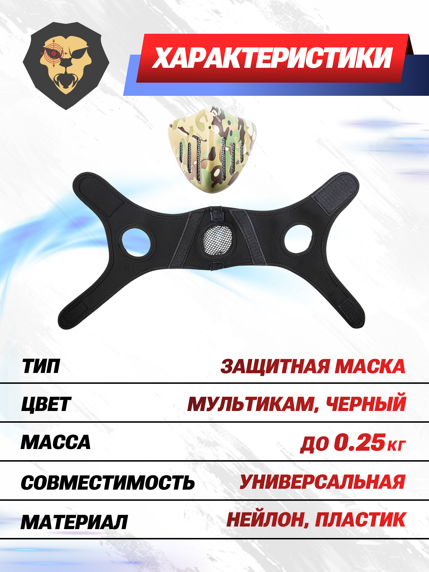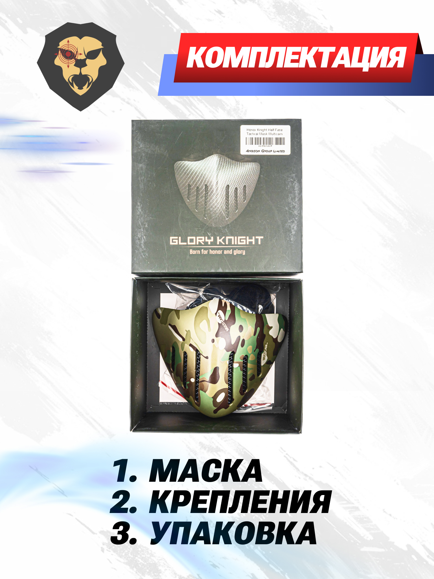 Информация о товаре "Маска защитная Anbison Sports Honor Knight Half Face (мультикам, AS-MS0108CP)" носит ознакомительный характер, и не является публичной офертой, определяемой положениями Статьи 437 Гражданского кодекса Российской Федерации, характеристики, внешний вид, цвет и комплектация могут быть изменены производителем без уведомления.