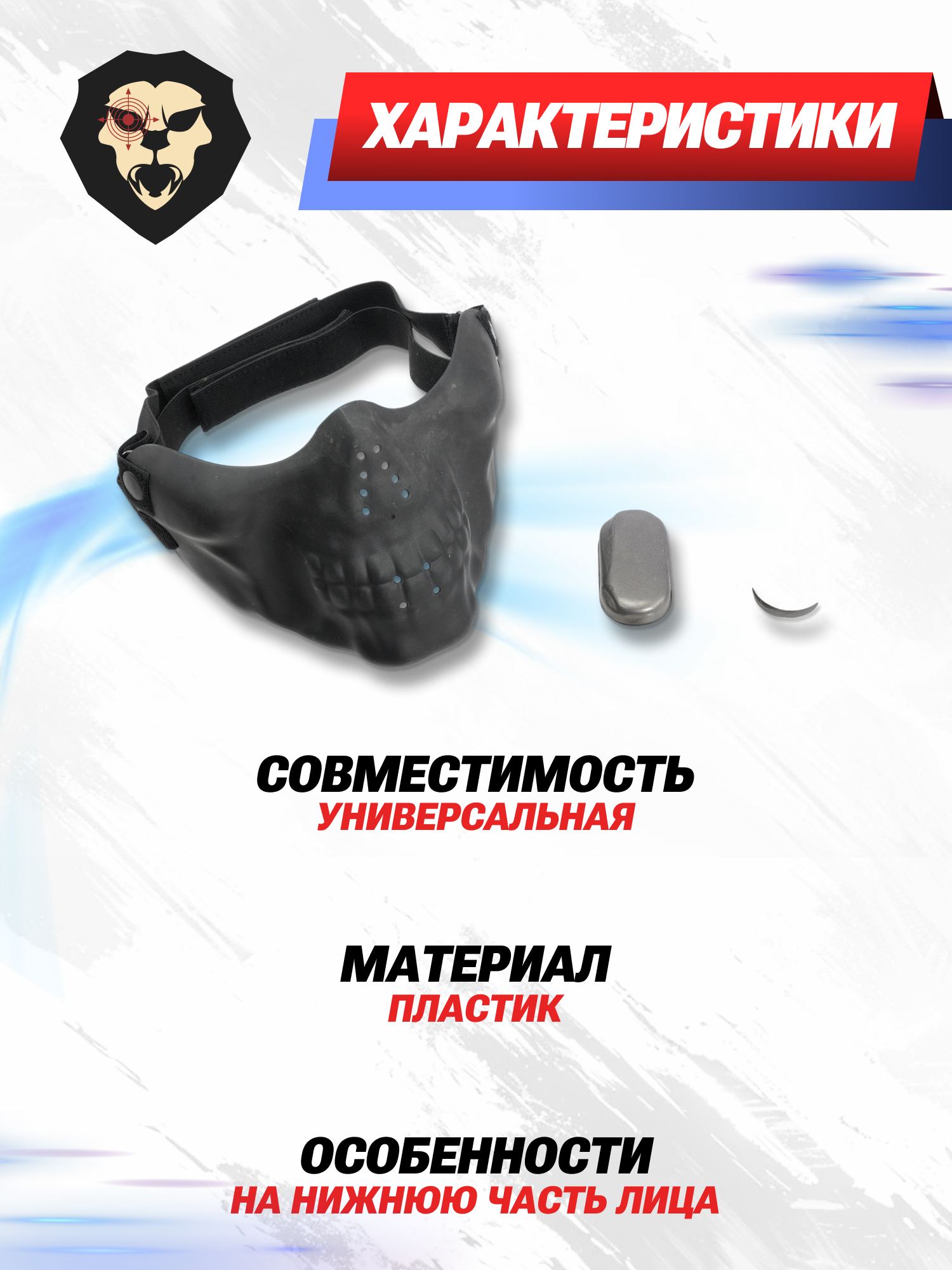 Рассматриваемая маска Anbison Sports Tactical изготавливается из полимерного материала, который, помимо легкого веса, также наделен повышенной износостойкостью и прочностью. Аксессуар выпускается в черном варианте и внешним видом повторяет нижнюю часть черепа. На AS-MS0016B присутствуют технологические отверстия, которые используются для увеличения вентилируемостью.