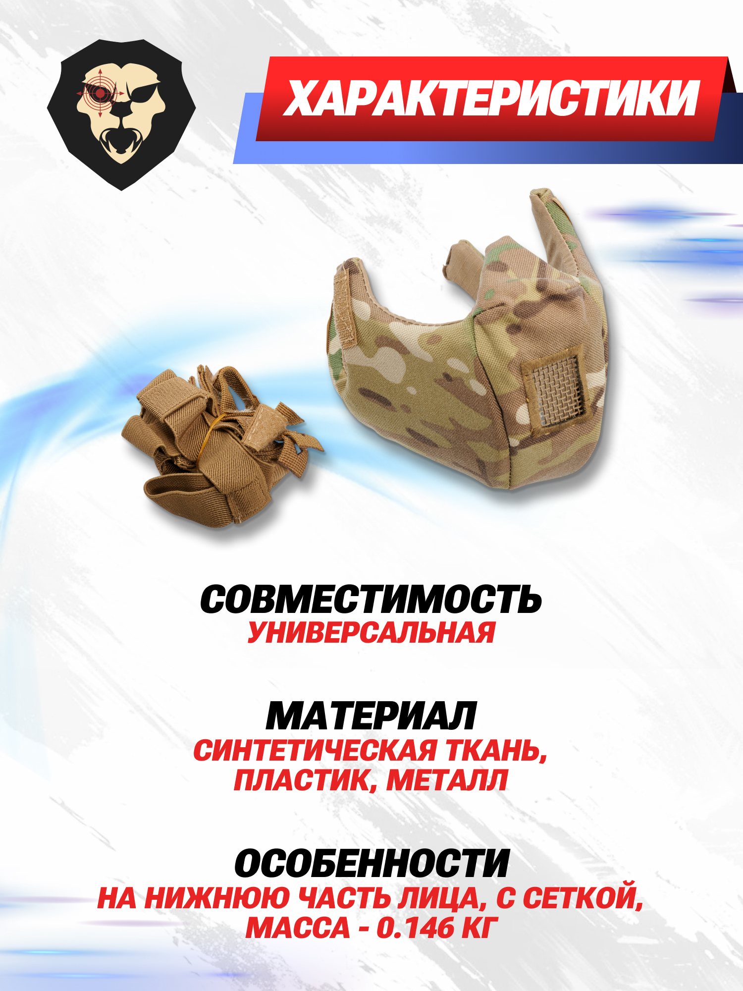 | Особенности | На нижнюю часть лица, с сеткой, масса - 0.146 кг |