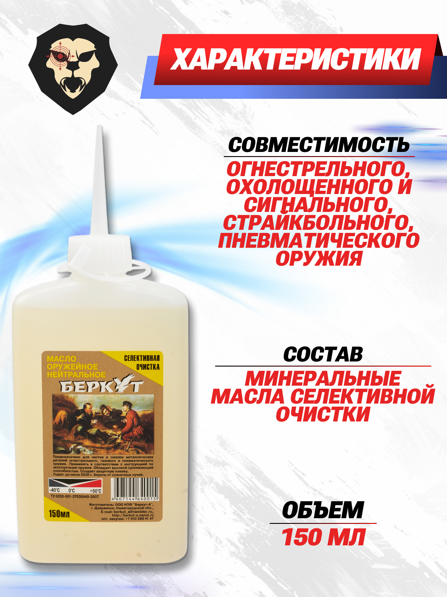 Изготавливается масло Беркут нейтральное с использованием переработанных очищенных минеральных масел. Такой состав при нанесении на металлические части оружия защищает материал от воздействия коррозии, образуя на нем специальную пленку.