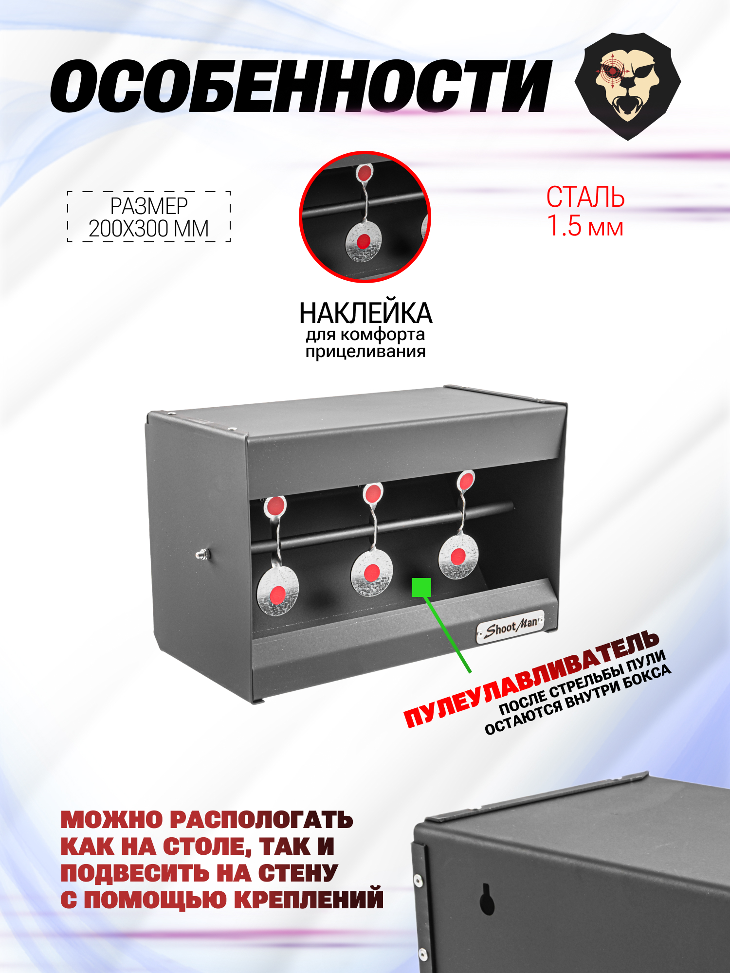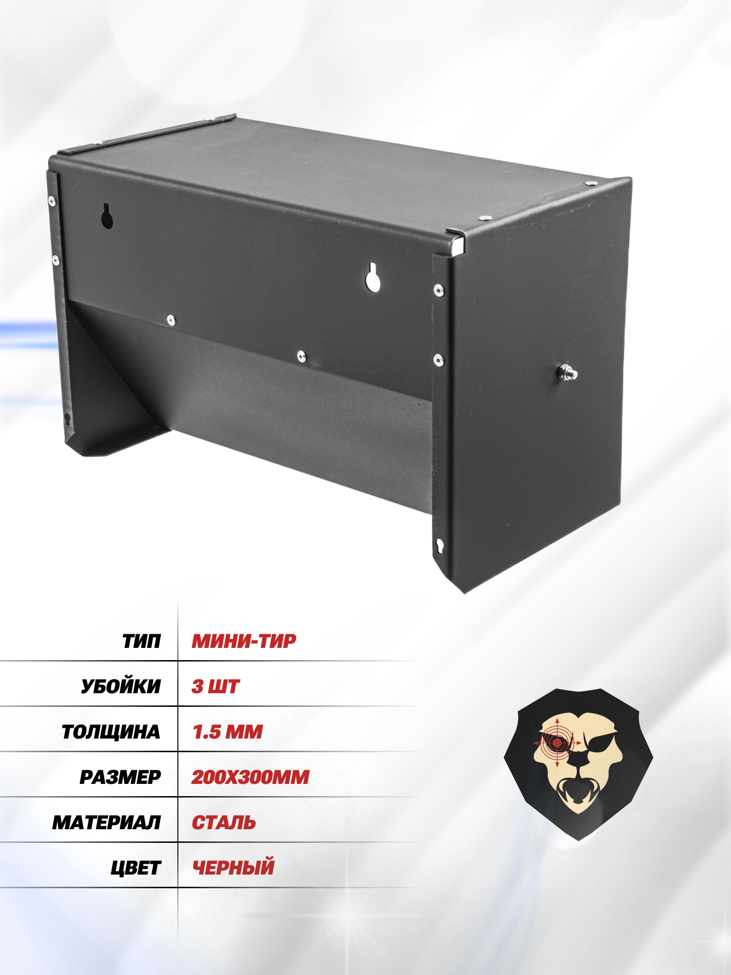 | Особенности | Пулеулавливатель, 3 мишени, толщина 1.5 мм, размер - 200х300 мм |