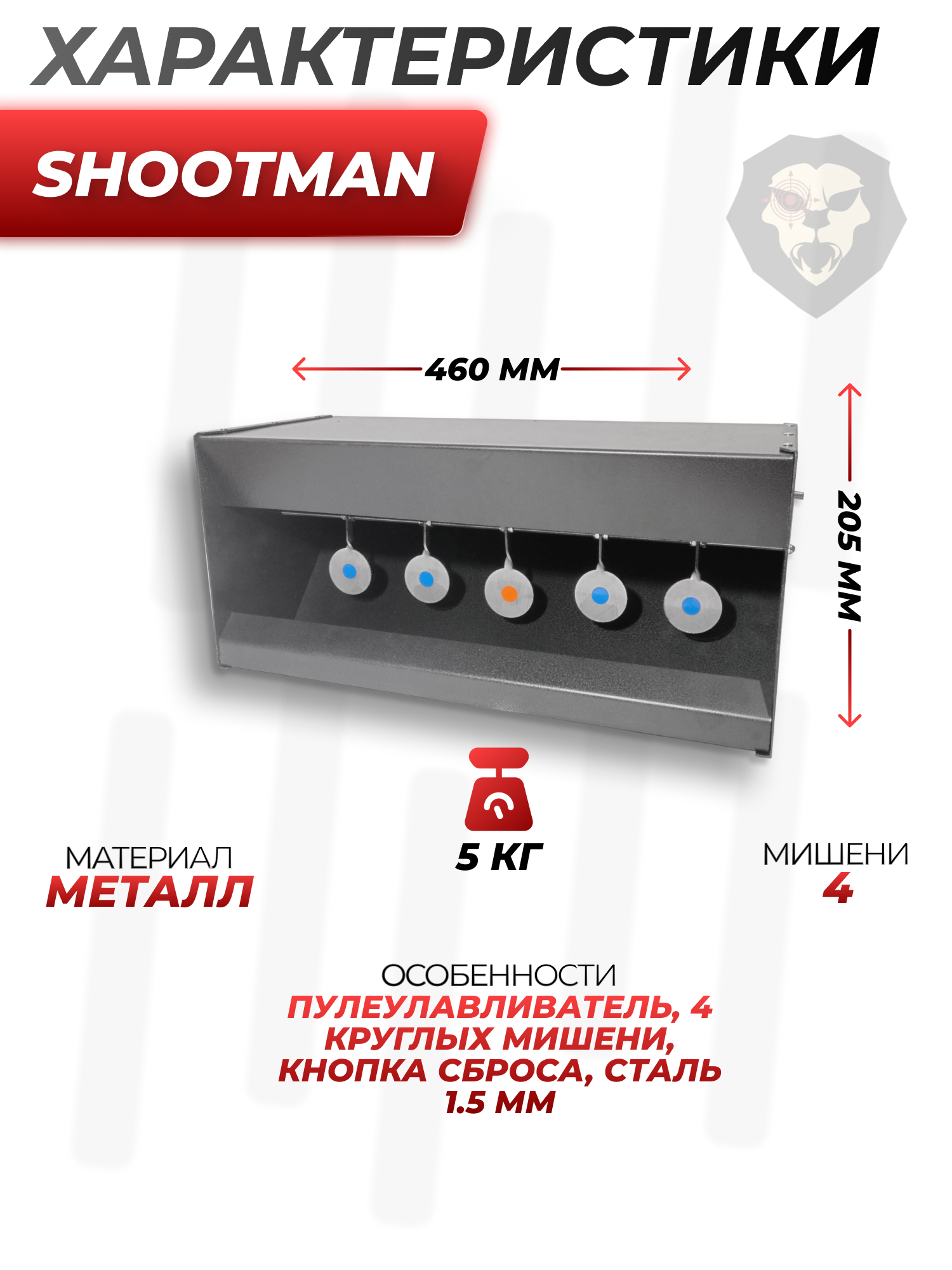 Особенности | Пулеулавливатель, 4 круглых мишени, кнопка сброса, сталь 1.5 мм, 460x205 мм |